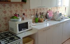 Pokoj zůstane nevybavený, až na jednu skříň. Na bytě se nachází kuchyň vybavená troubou i mikrovlnkou. V koupelně je i pračka se sušičkou.
