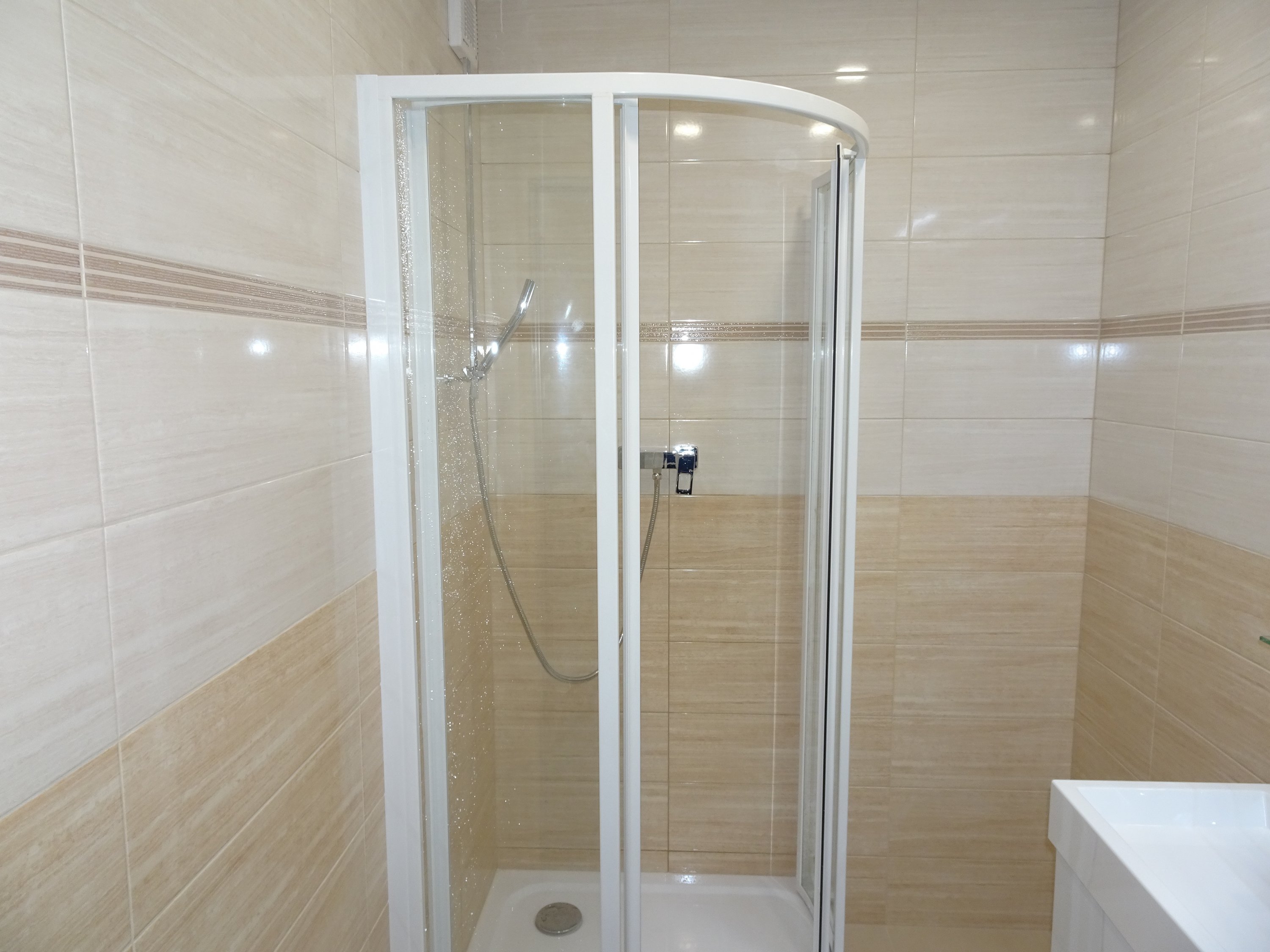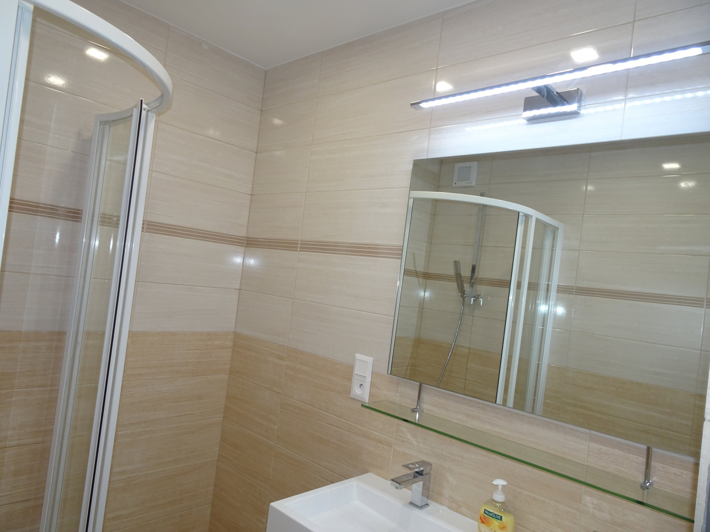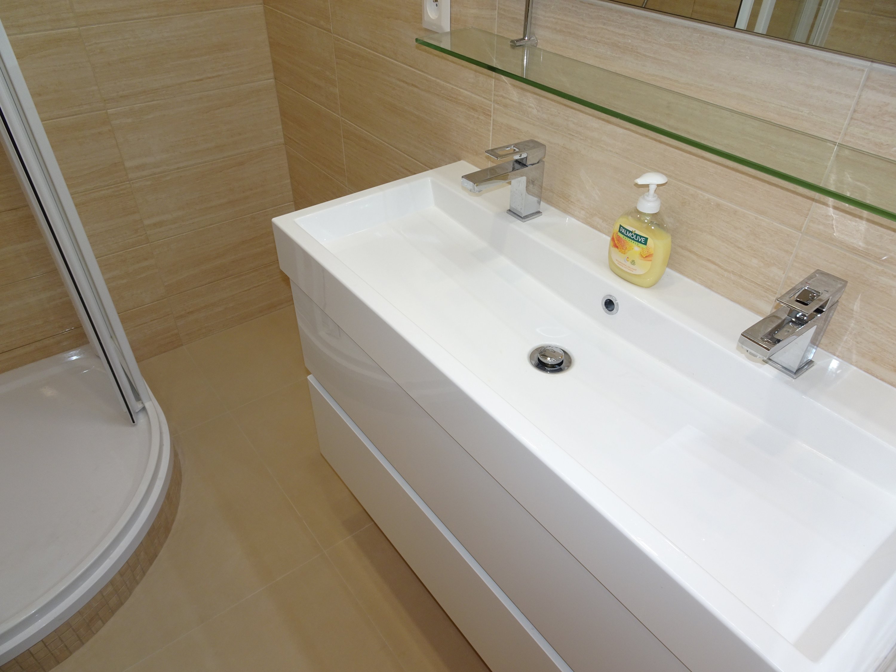 Koupelna - moderní obložení a sprchový kout, dvojumyvadlo se spodní skříňkou, velké zrcadlo