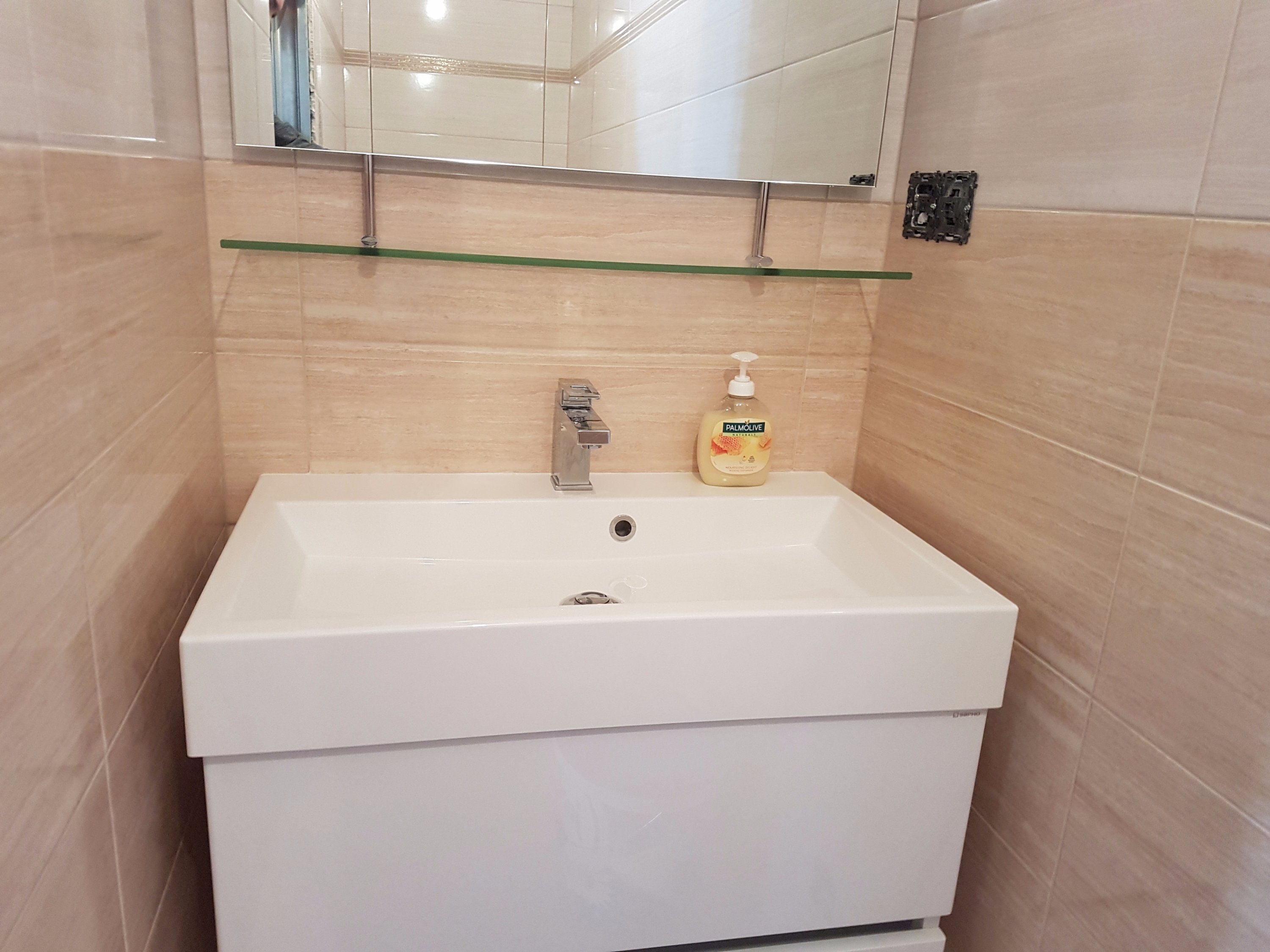 WC - moderní obložení a záchod, umyvadlo se spodní skříňkou, zrcadlo