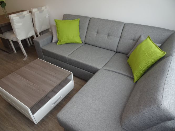 3. pokoj obývací a kuchyň - rohová sedačka, velká TV, velká kuchyně (indukční deska, trouba, myčka, vestavěné spotřebiče - mikrovlnná trouba, lednice, kompletní vybavení pro vaření a stolování, jídelní stůl pro 4)