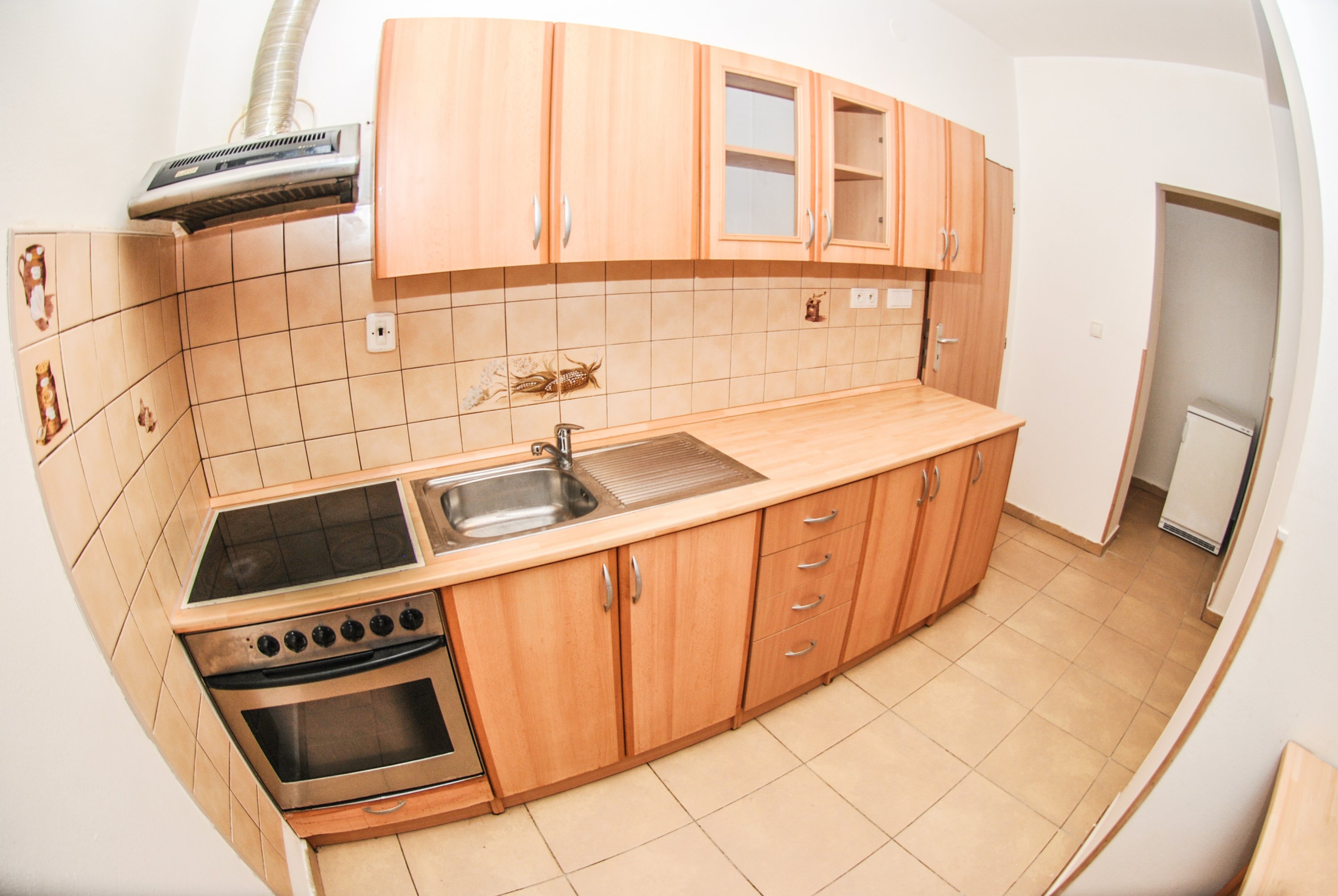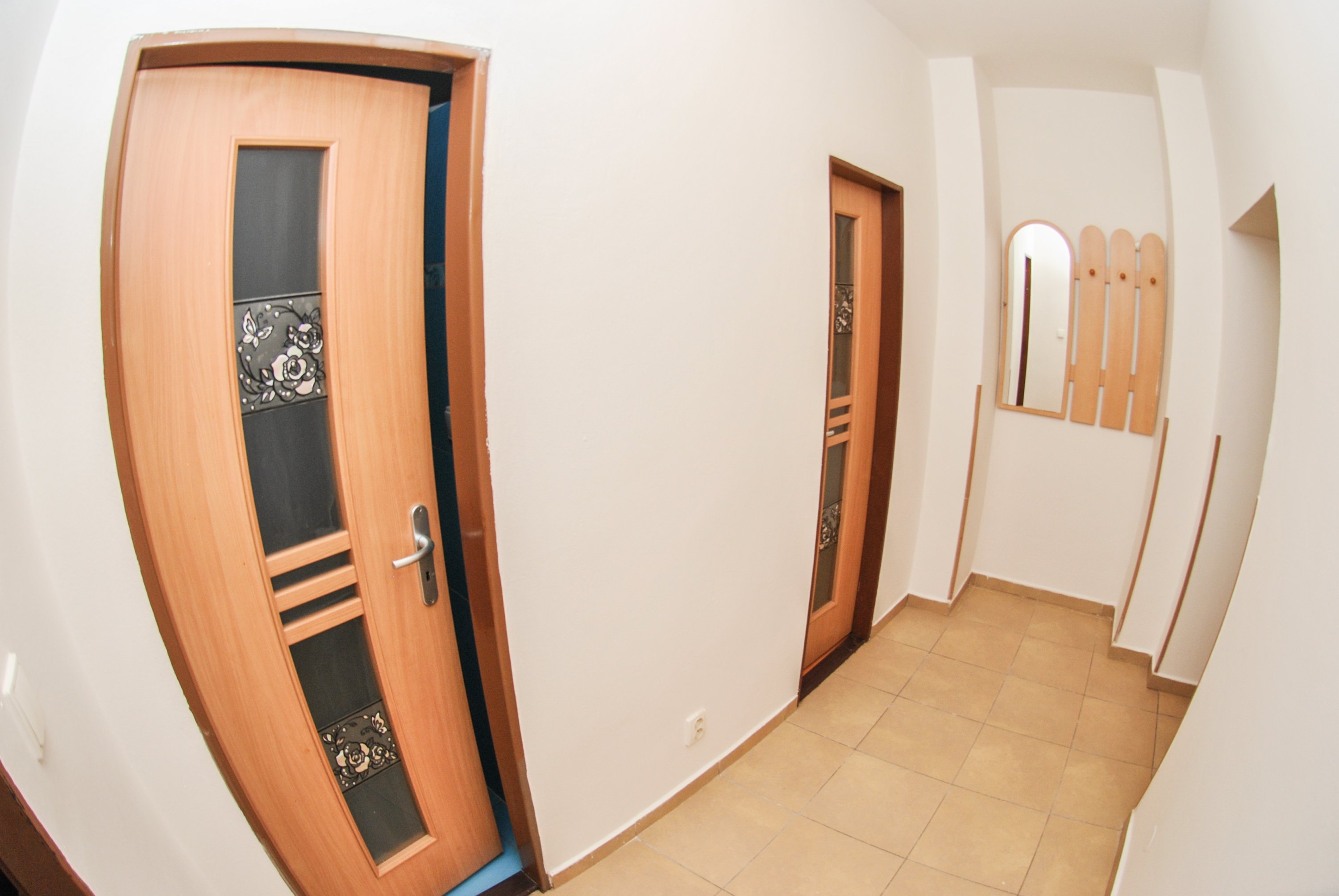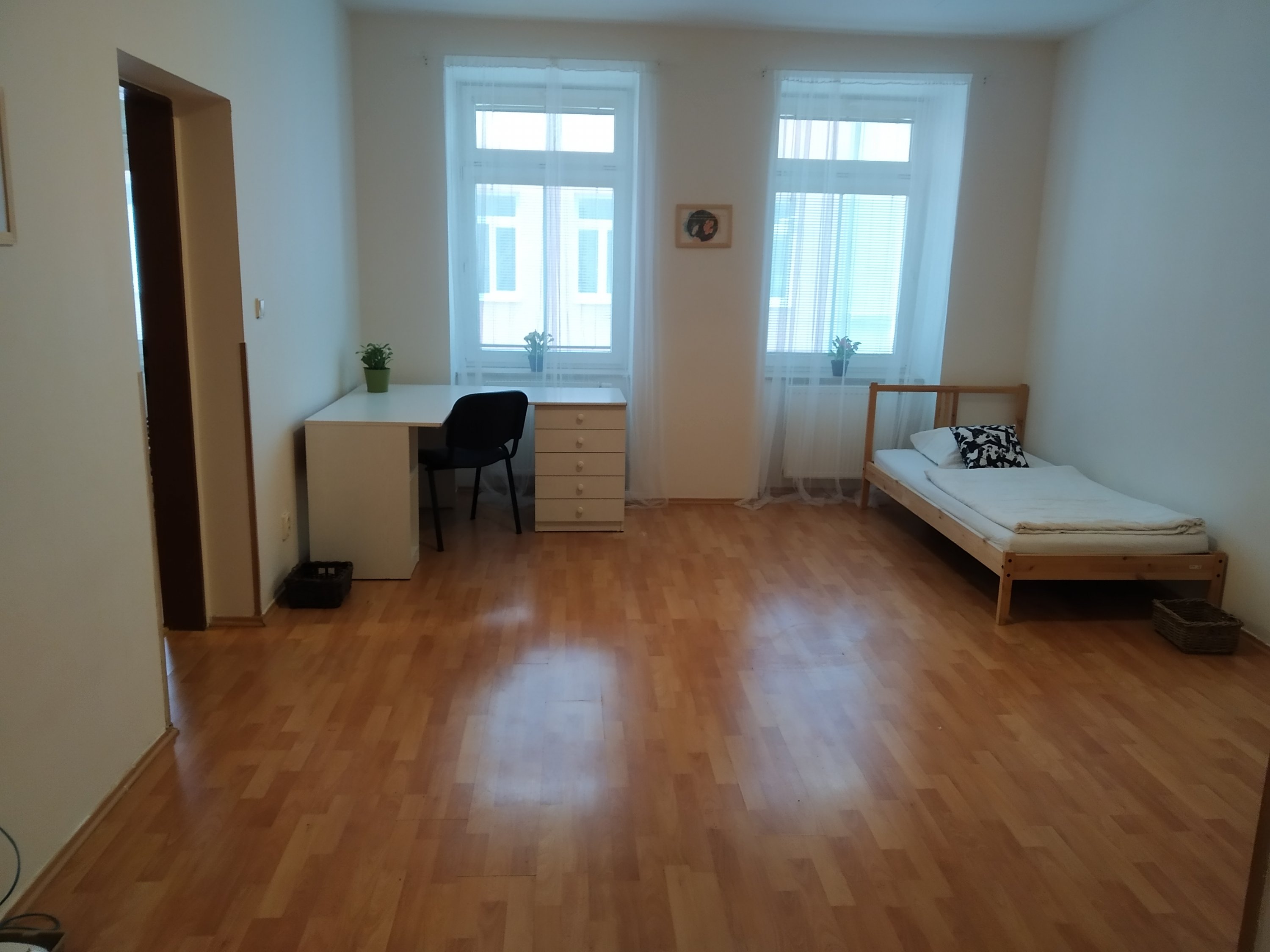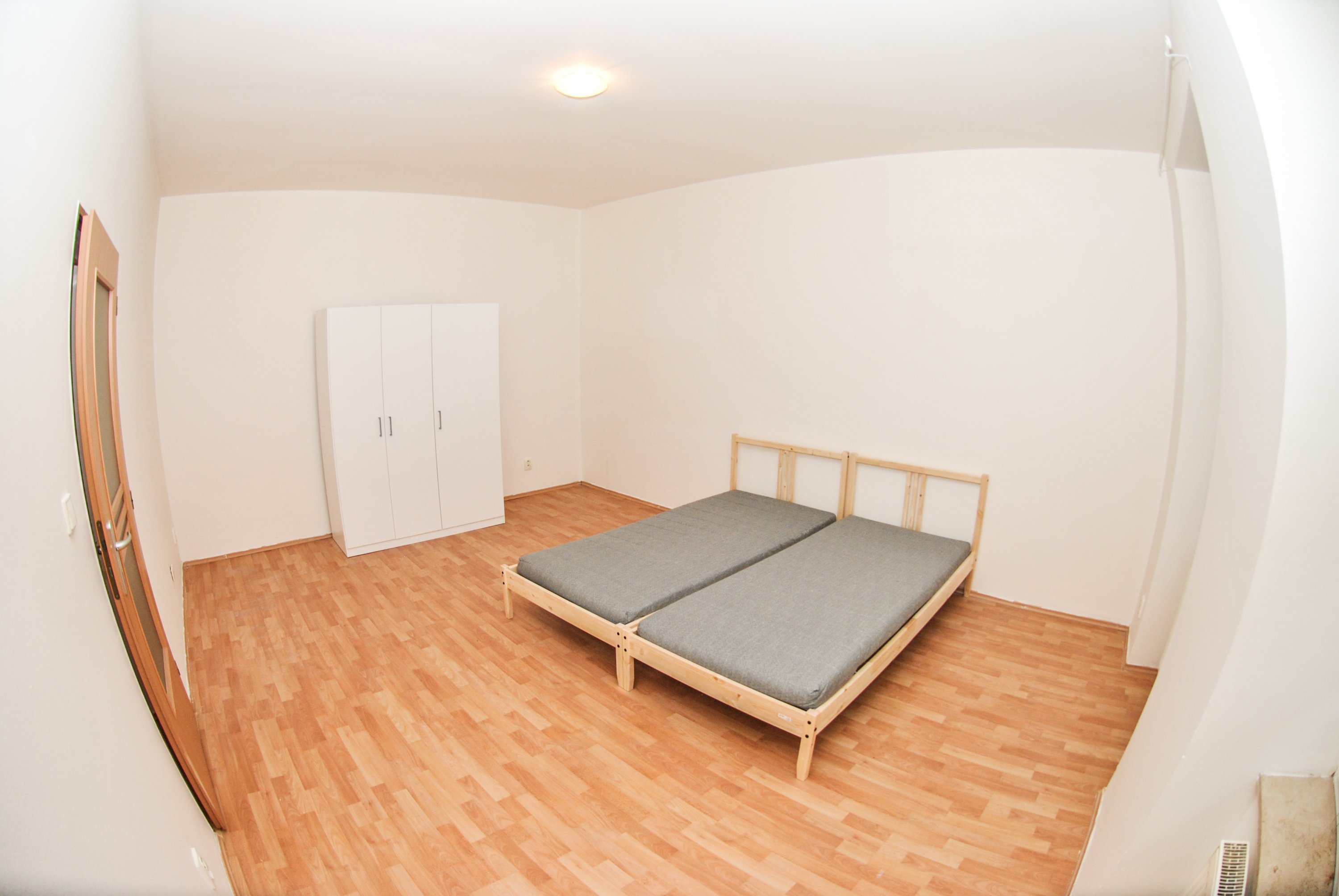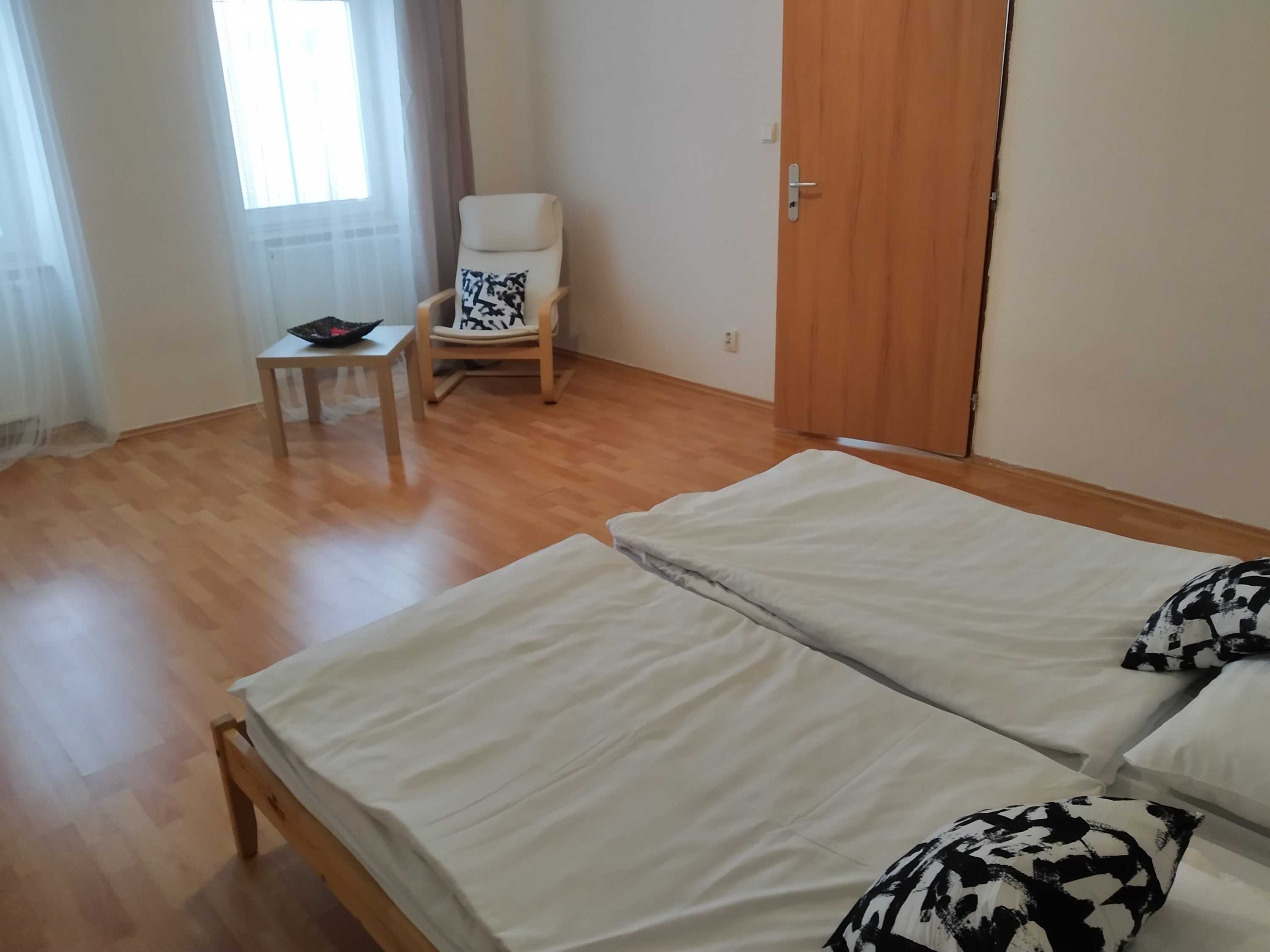 Rent a spacious apartment 2+kk on Spolkova street in Brno. The apartment has a hallway, a smaller room that can be used as a dressing room or for storage of cleaning things, bathroom (bath, sink, washing machine), separate toilet. The main room with kitchenette is equipped with appliances (hob, oven, fridge) and dining table with chairs, couch and bed. In the bedroom a wardrobe and two single beds, an armchair and a coffee table.