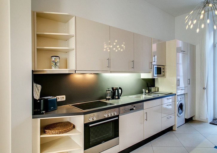 Byt se skládá z obývacího pokoje, malé ložnice, kuchyně s malým jídelním koutem, koupelny s toaletou, sprchy a pračky.