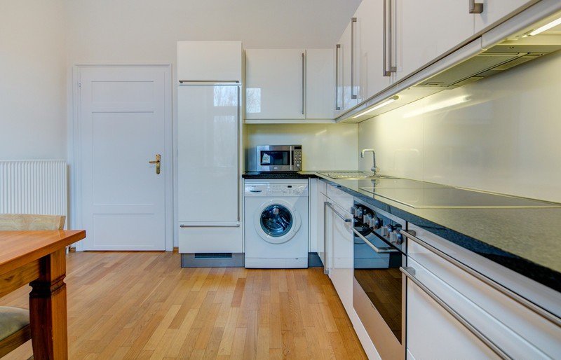 Dubové parkety, žulové desky v koupelně a kuchyni.