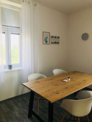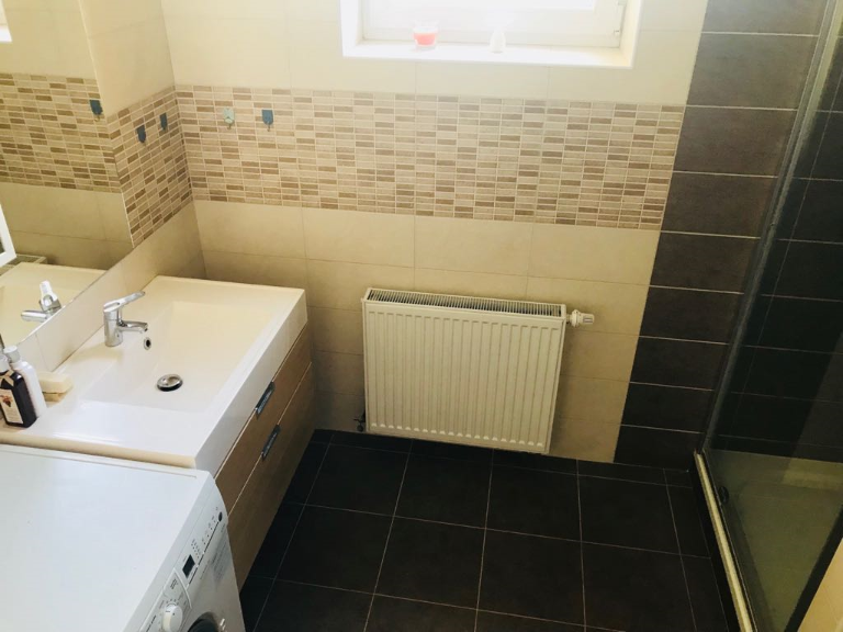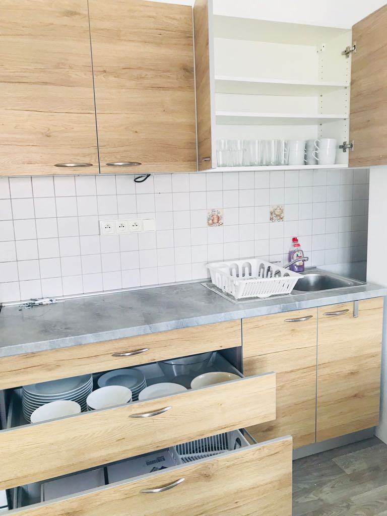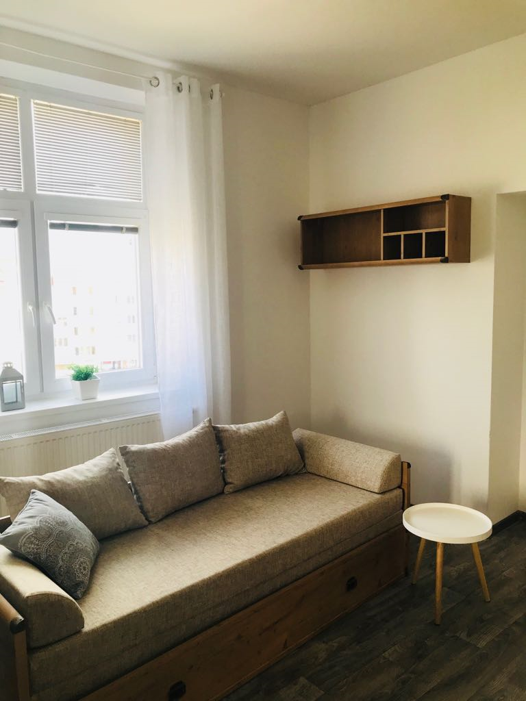 Vybavení bytu: plně vybavená kuchyň, lednice, sporák, trouba, mikrovlnná trouba, mrazák, jídelní stůl+židle, pohovka, sprchový kout, pračka, žehlička + prkno, sušák na prádlo.