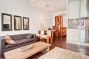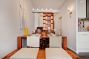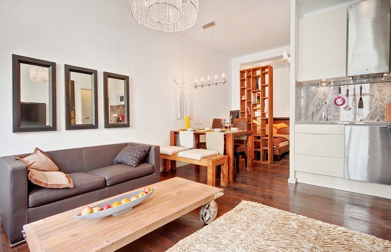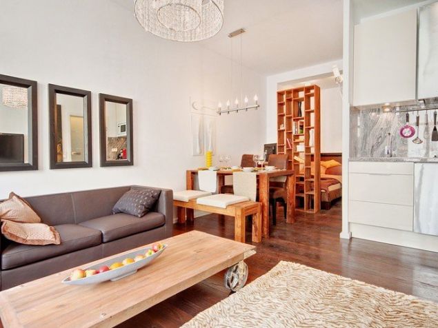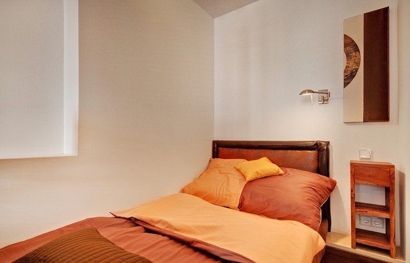 Kožená pohovka, police, posteľ typu queen.