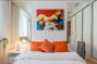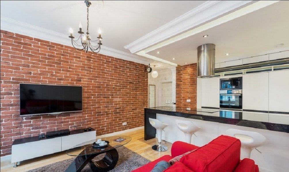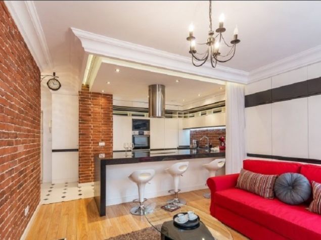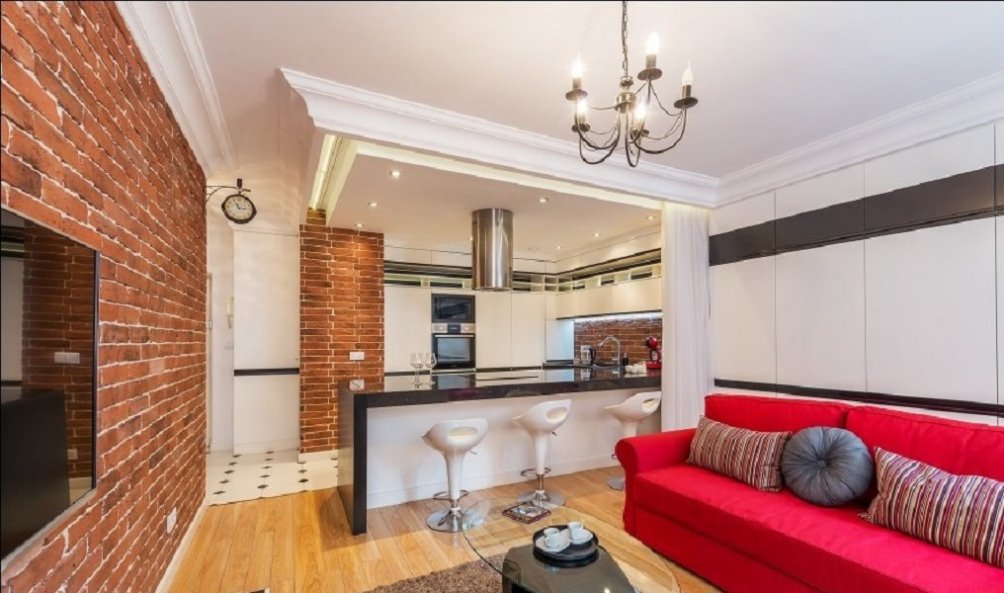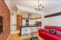 Apartmán se skládá ze dvou pokojů: ložnice s manželskou postelí a psacím stolem a obývací pokoj s kuchyňským koutem odděleným ostrovem, v obývacím pokoji je rozkládací pohovka pro 2 osoby.
