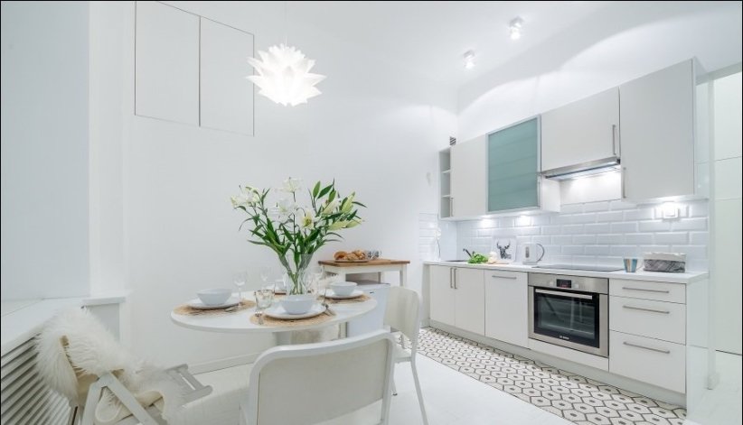 Kuchyňa: chladnička, indukčná varná doska, rúra, rýchlovarná kanvica, umývačka riadu, stôl a stoličky