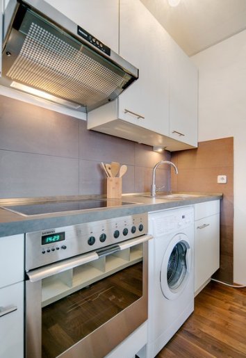 Kompletní kuchyňská linka s elektrickým sporákem, troubou, lednicí, mrazákem, myčkou nádobí a nádobím