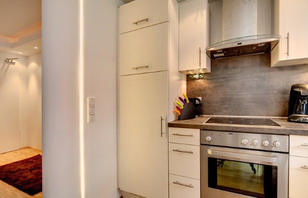 Kvalitní kuchyně otevřená do obývacího prostoru, dobře vybavená, s oknem, sklokeramickou deskou, digestoří, elektrickou troubou, kávovarem, lednicí, myčkou, lednicí s mrazákem, barovou stoličkou
