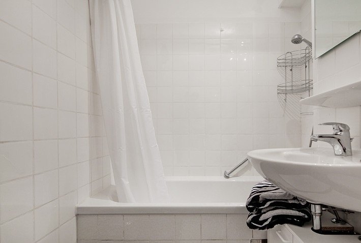 Koupelna s vanou a pěknou zrcadlovou skříňkou. Vybaven je také vanou, kobercem a dávkovačem mýdla. Podlaha s jasnými dlaždicemi.