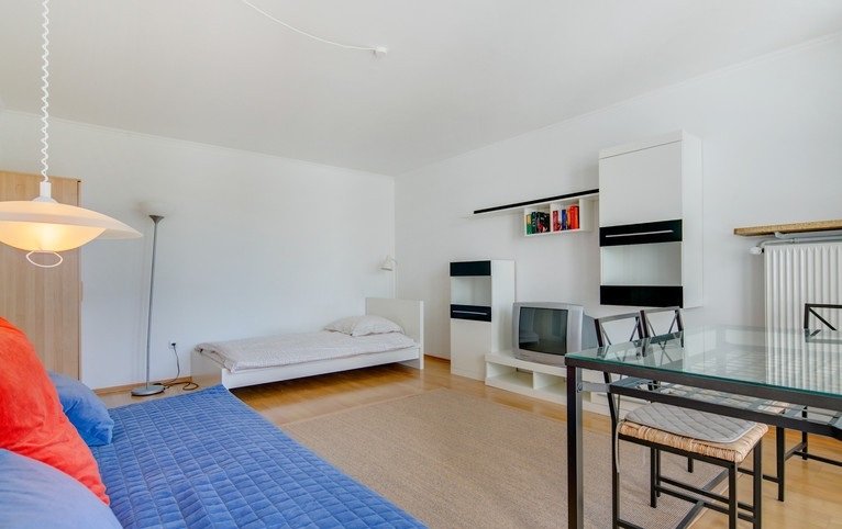 V obývacím pokoji je pohovka a postel, vestavěná skříň a vysoce kvalitní záhyby na obrazových oknech. Kvalitní podlahové parkety poskytují pohodlí.