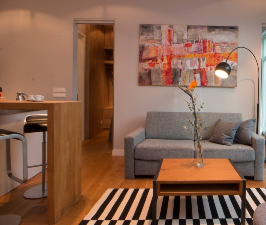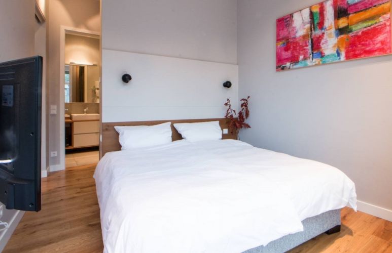 Moderní koupelna a pohodlná otevřená kuchyně a obývací pokoj.