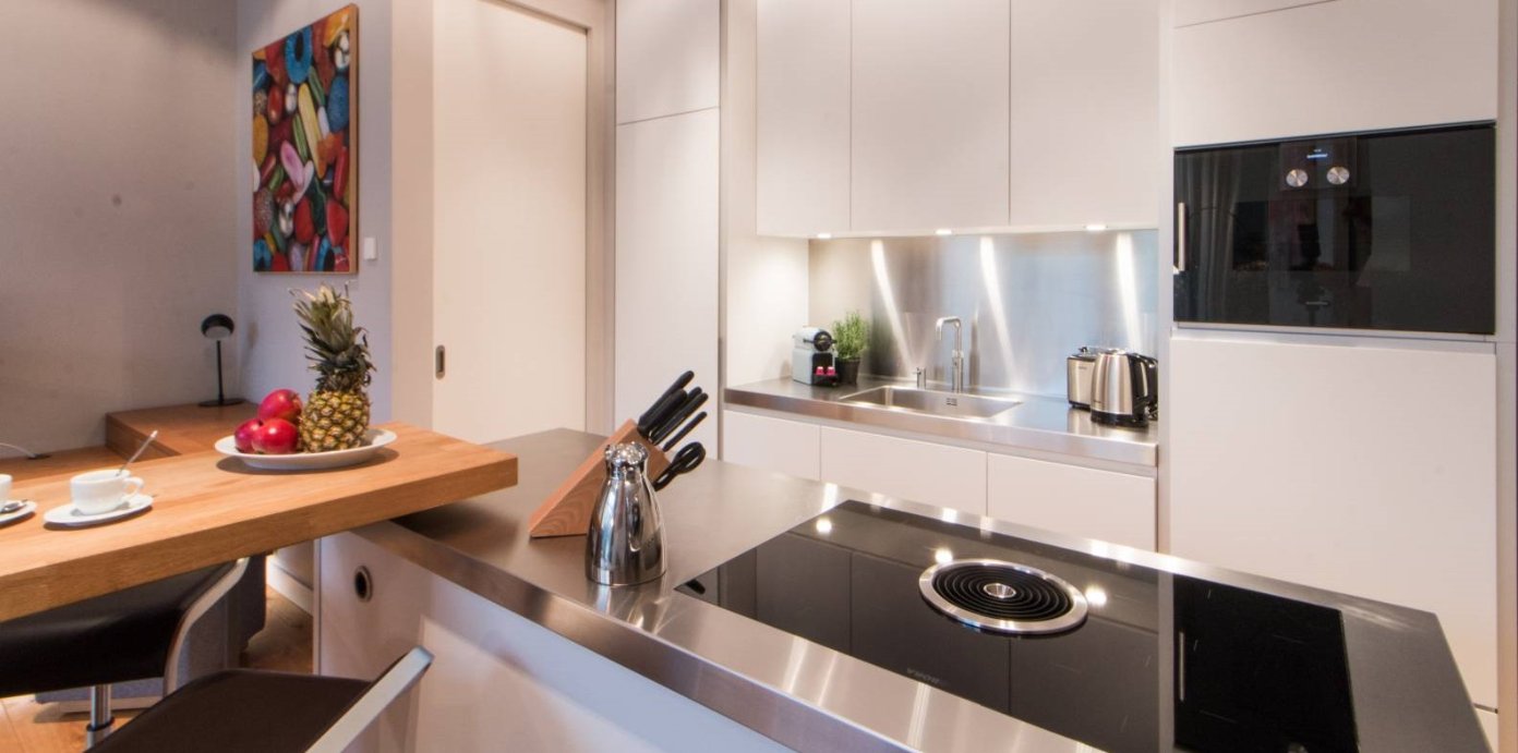 Moderní spotřebiče včetně trouby, myčky a kávovaru.
