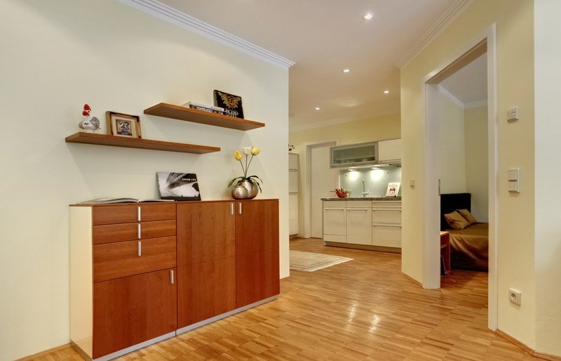 Nabízí prostorný obývací a jídelní kout, ložnici s připojenou koupelnou a skříňový prostor a úložnou místnost. Byt zaujme svým vysoce kvalitním vybavením, dobrým uspořádáním místnosti, parketovými podlahami a vysoce kvalitním vybavením, které poskytuje dostatek úložného prostoru.