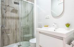Moderní kuchyně se sklokeramickou varnou deskou, vestavěná skříň na chodbě, moderní koupelna s vanou.