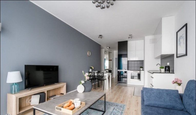 Obývací pokoj: rozkládací pohovka 140x200, stůl se židlemi, konferenční stolek, TV skříň, SMART TV.