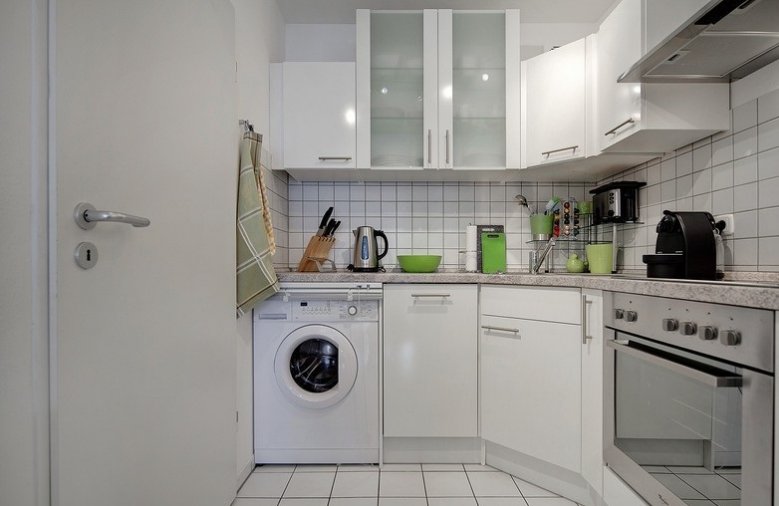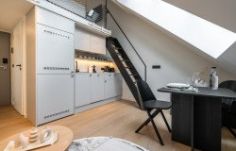 Moderní byt 2+kk ve 3. patře cihlové novostavby, zařízen novým nábytkem a spotřebiči.