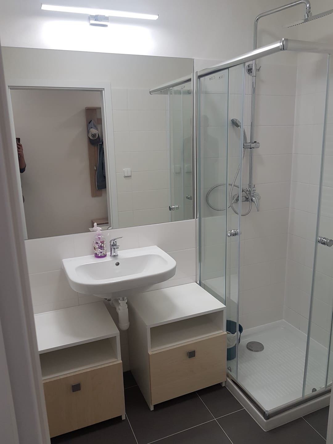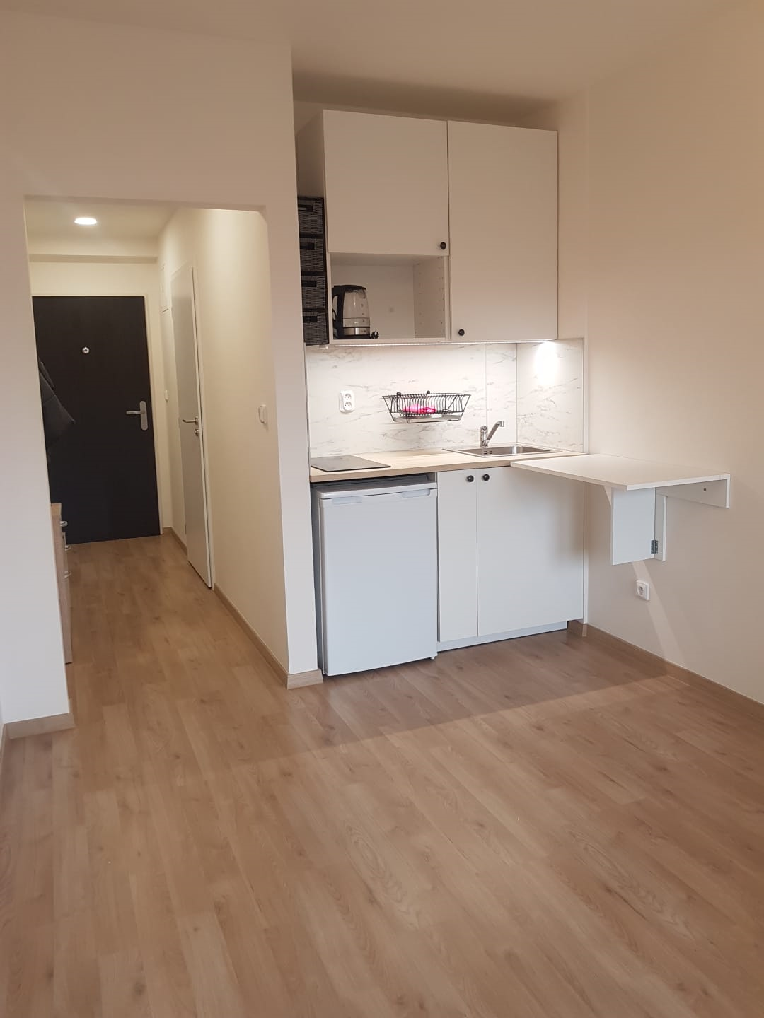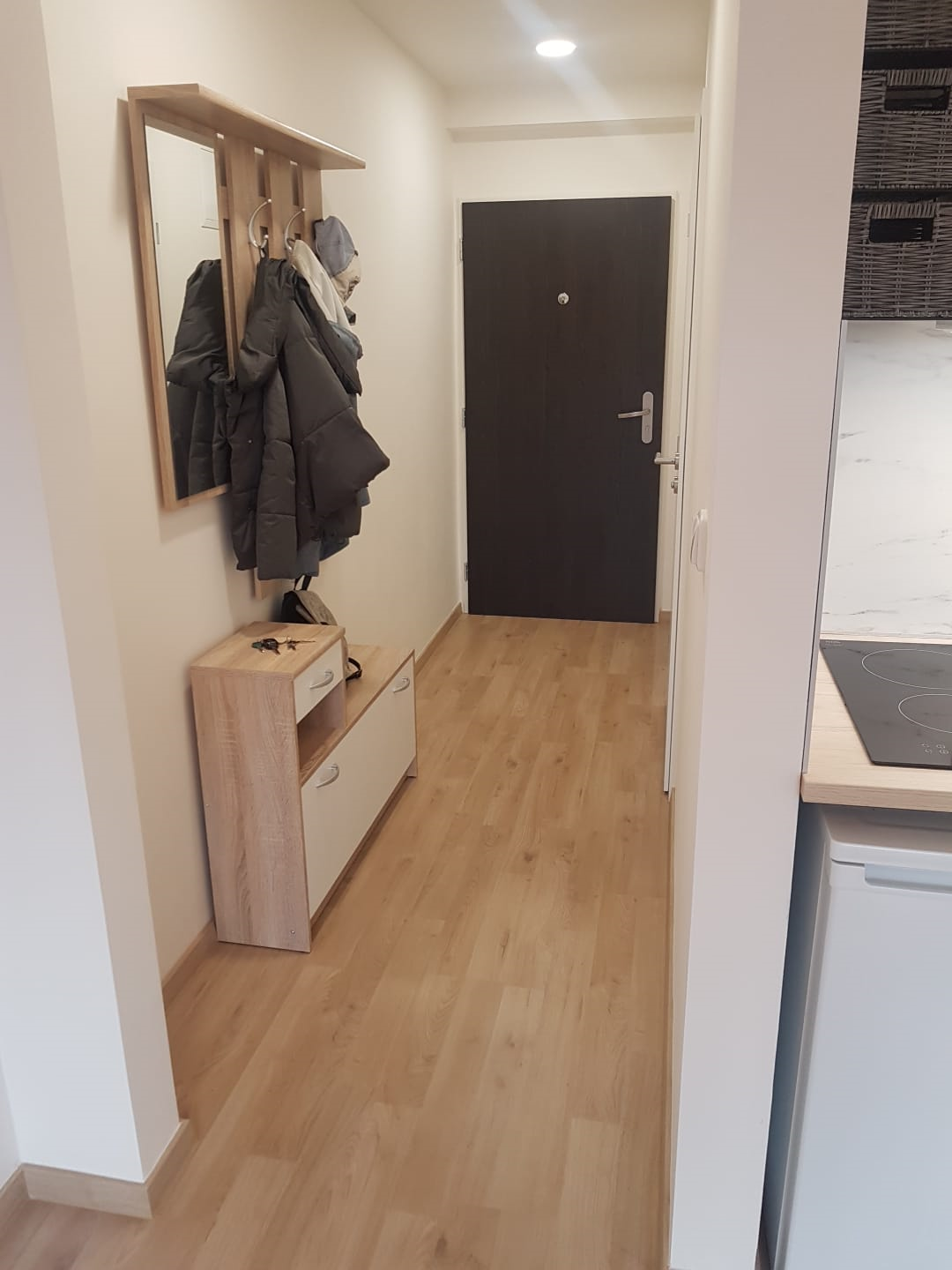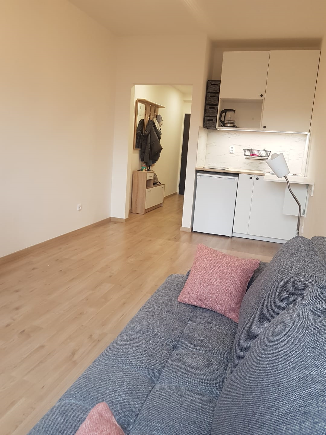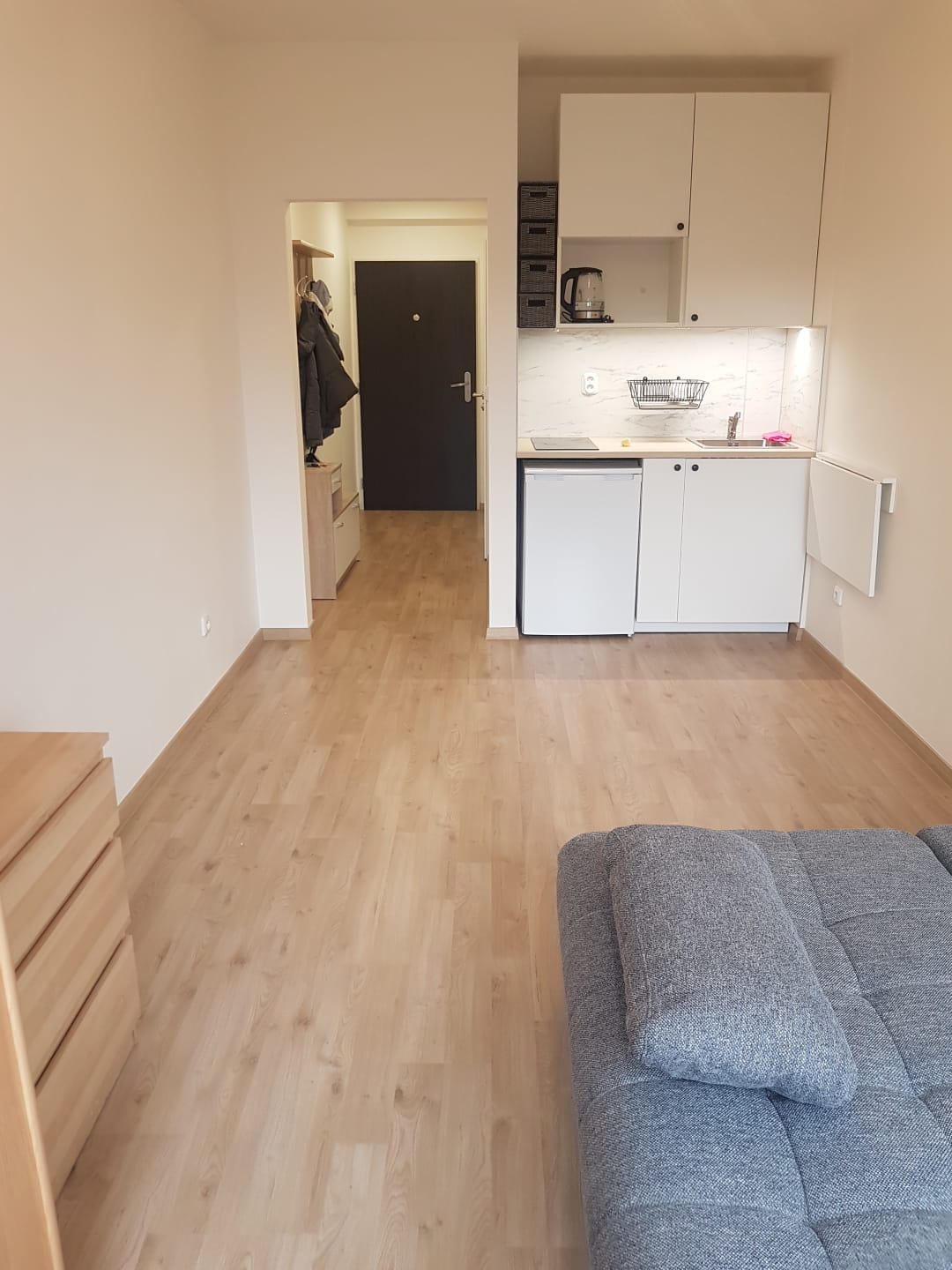 Byt 23 m2 se nachází ve 3. patře novostavby s výtahem. Tvoří ho světlý obývací pokoj s dřevěnou podlahou, postelí/rozkládací pohovkou 140 cm, šatní skříní, komodami, jídelním stolem a židlemi, chytře lazenou kuchyňskou linkou s varnou sklokeramickou deskou, ale i mikrovlnou troubou, dále chodba s věšákem a botníkem a prostorná koupelna s velkým zrcadlem, sprchovým koutem. Rezidence má mnoho sdílených prostor: sdílenou prádelnu s pračkami a sušičkami (po domluvě je možné vybavit vlastní pračkou v koupelně), bezplatné fitness, místnost s velkoplošnou TV, rozsáhlou relax zonu s pohovkami, křesly a krbem, kam můžeš pozvat přátele, také zahradu s terasou a grillem a komunitní zahrádkou, a non-stop recepci. (vkládání odkazů do textu není povoleno)