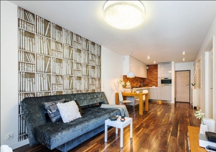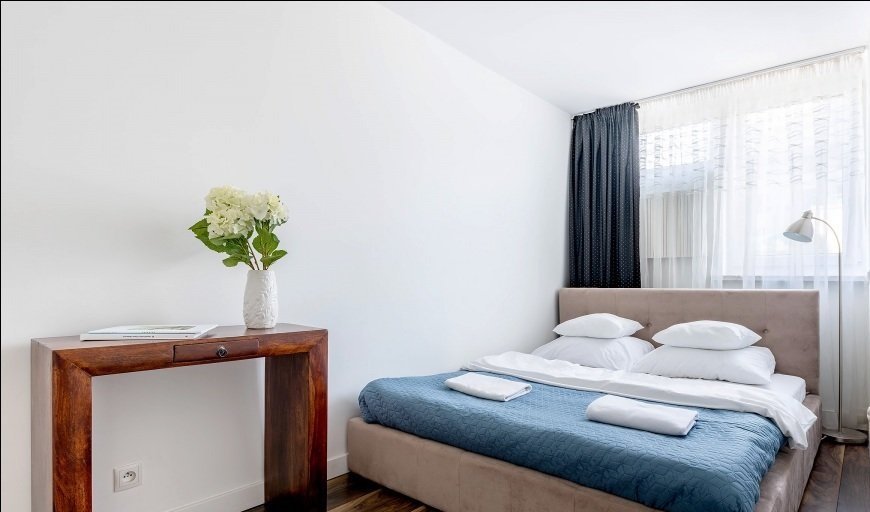 Byt se skládá z obývacího pokoje s kuchyní, ložnice s velkým šatníkem a koupelny. Byt je plně vybaven: pračka, sušička, kuchyň, trouba s mikrovlnnou funkcí, lednice, myčka. V ložnici je jedna manželská postel, v obývacím pokoji rozkládací pohovka.