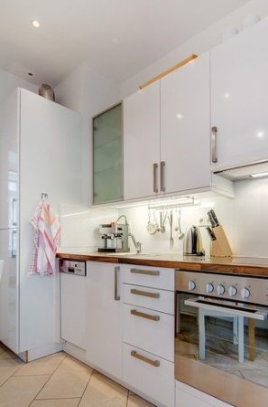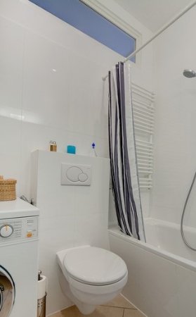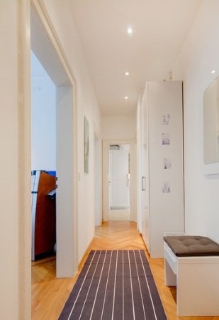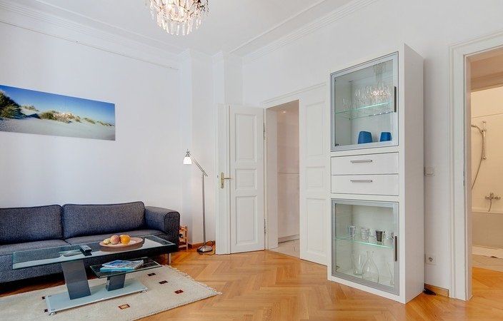 Kvalitní vybavení: parkety, podlahové vytápění, moderní kuchyňská linka včetně všech spotřebičů (pračka, elektrický sporák se sklokeramickou deskou, digestoře, lednice s mrazákem a mikrovlnná trouba). Posuvné dveře šetřící prostor, které vedou do zdi mezi obývacím pokojem a předsíní nebo ložnicí.