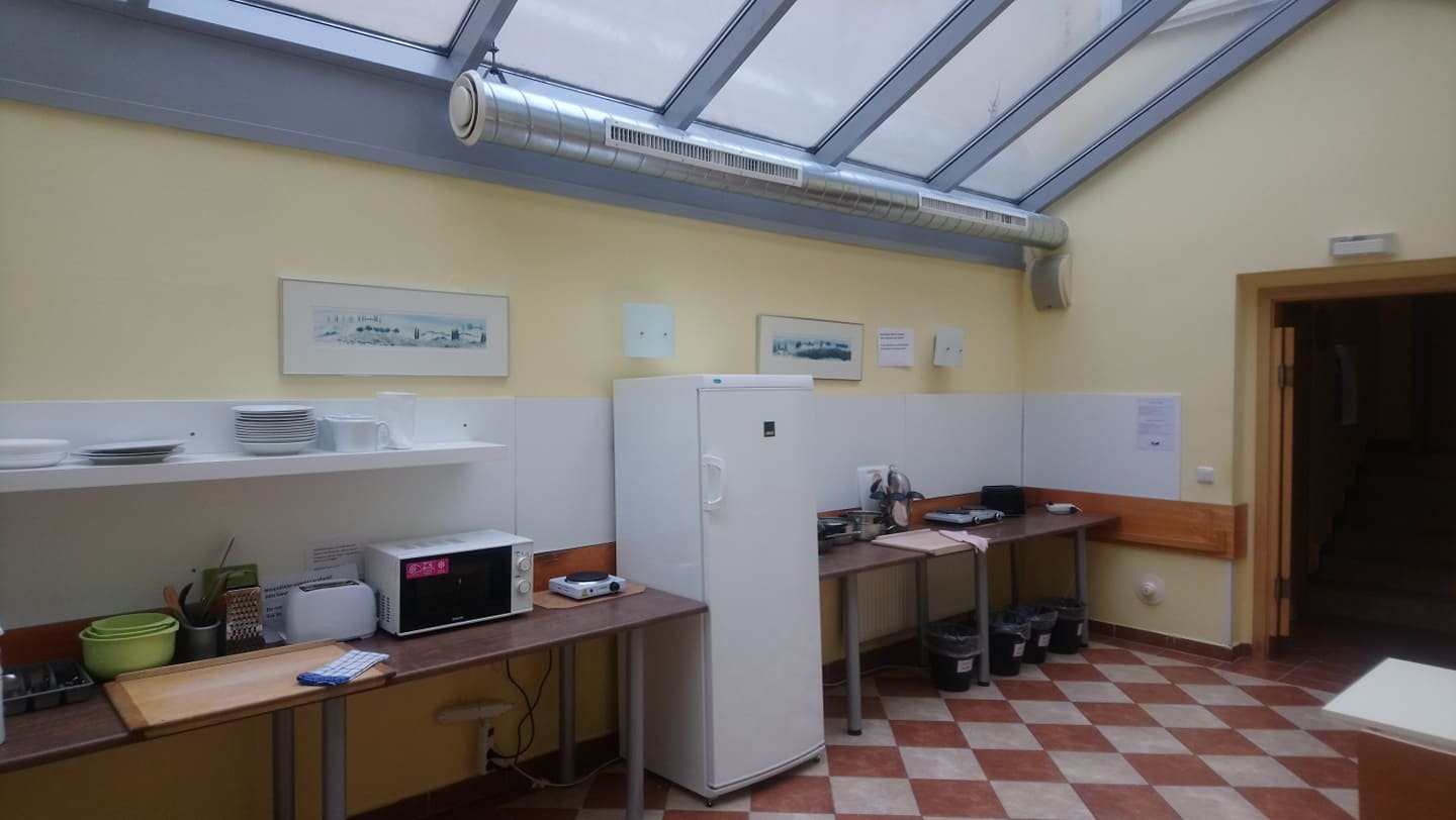 K dispozici je sdílená kuchyňka s vařičem, mikrovlnkou, varnou konvicí, toasterem a lednicí, nechybí ani pračka a sušička.