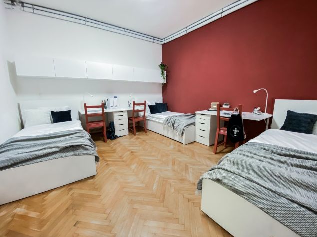 Pokoje se nachází ve studentském domě se dvěmi koupelnami, dvěmi kuchyněmi a dvorem s venkovní kuchyní (grill) a posezením. Součástí domu je i sklep a prádelna s profesionální pračkou a susičkou s možností uložení věcí.