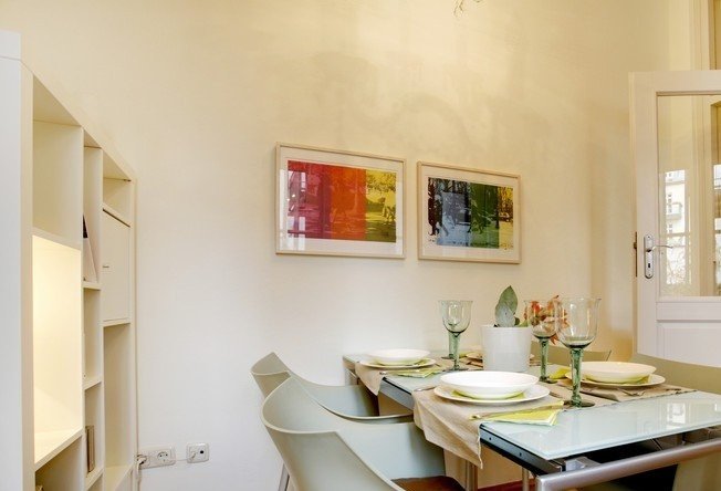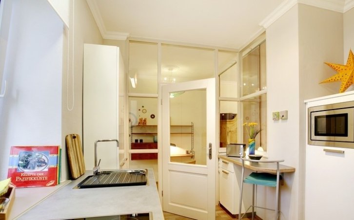 Velmi dobře vybavená kuchyň s oknem, dobře vybavená, myčka, lednice, mikrovlnná trouba, sklokeramická deska, elektrická trouba. Umístění bytu: velmi dobrá rezidenční čtvrť