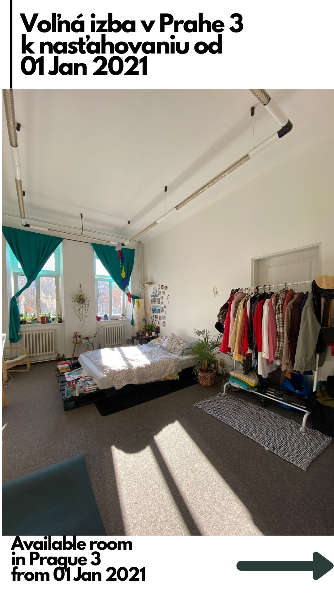 V našom byte v Prahe 3 bude od 01 Januára 2021 k dispozícii voľný krásny svetlý nepriechodný pokoj, 20m, čiastočne zariadený.