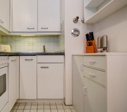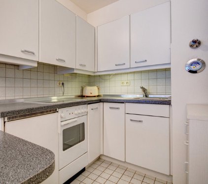Dobrá bytová kuchyň, sklokeramická deska, digestoř, elektrická trouba, lednice s integrovaným mrazákem, jídelní stůl se 2 židlemi