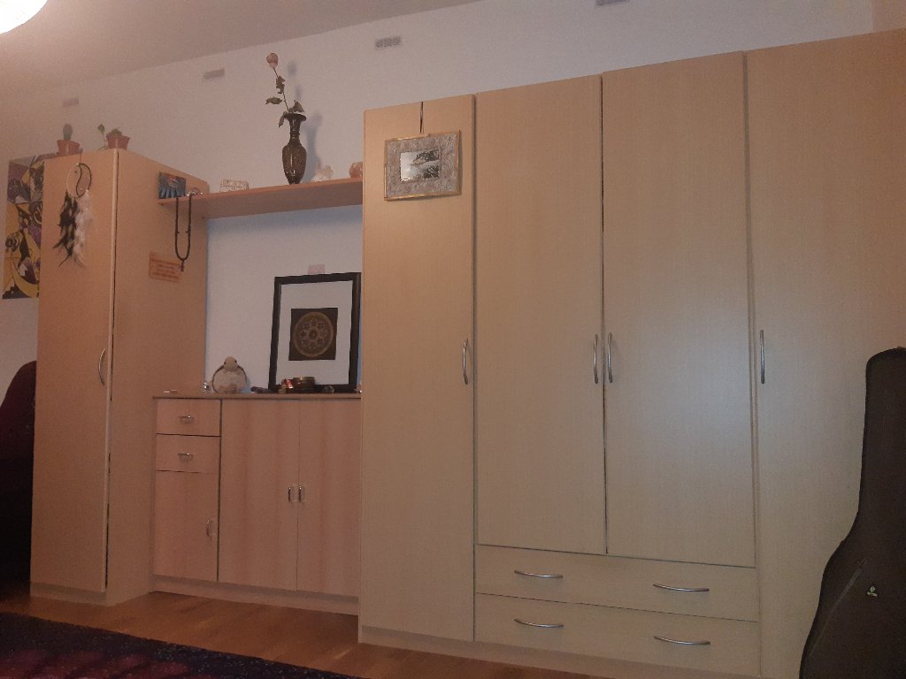 - V pokoji zůstává skříňová stěna, noční stolek a křeslo. Skládací postel, židli a pracovní stůl lze odkoupit od současné nájemkyně.