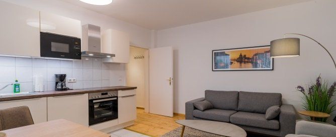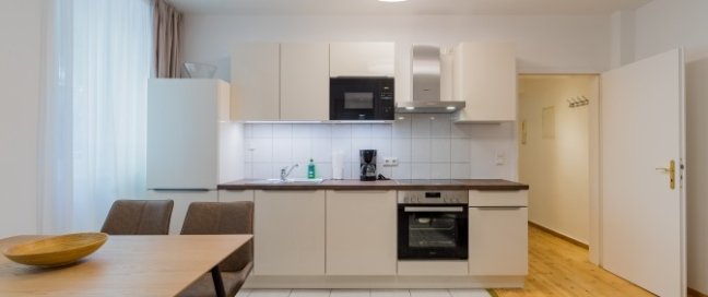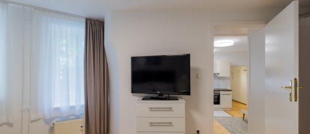Vkusně zařízený byt. Jídelna s vybavenou kuchyní a všemi potřebnými spotřebiči, ložnice, koupelna. Ložnice je celá bílá a má vkusný nábytek. V obývacím pokoji je pohovka, jídelní stůl, TV a hudební systém.