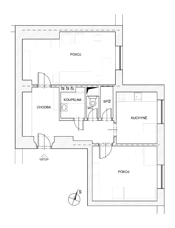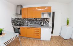 Kuchyně s jídelním koutem vybavená plynovým sporákem a spíž. Samostatné neprůchozí pokoje se základním vybavením dle fotografií. V koupelně je vana, umyvadlo, nový otopný žebřík, pračka. Samostatné WC. V bytě se nachází spousta úložného prostoru. Možnost připojení internetu až dle případných požadavků.