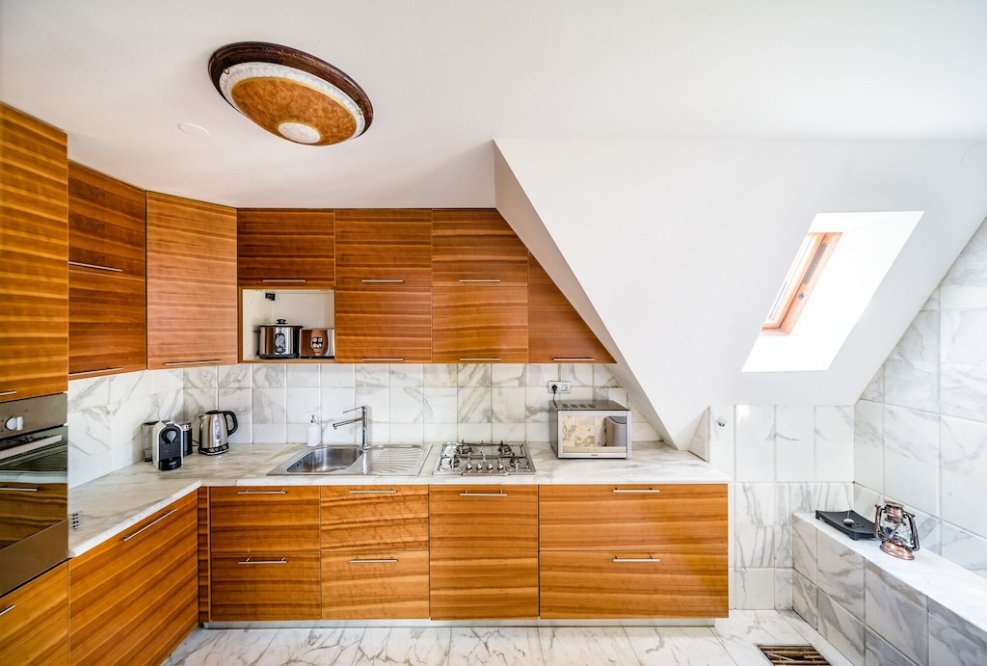 kuchyň (trouba, myčka, mikrovlnka, mraznička) s malým barem. Plynové topení.