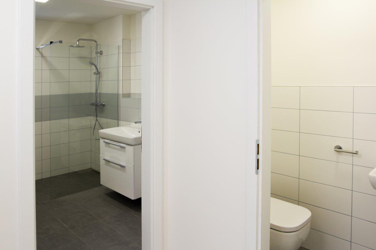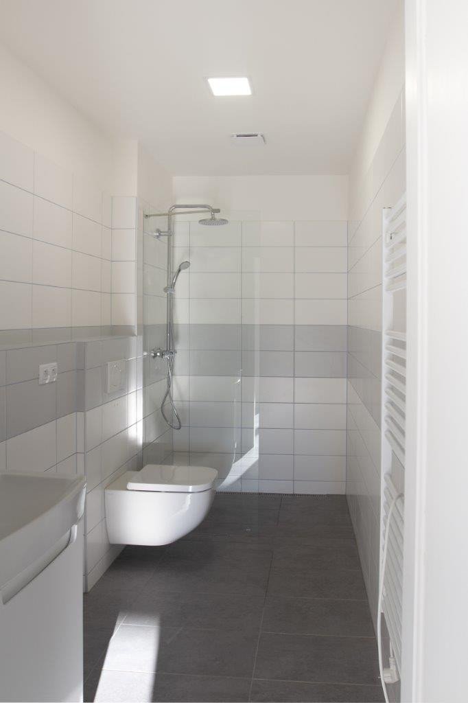 The bathroom with shower is equipped with a massage shower head, illuminated mirror cabinet; in case of interest, a washing machine will also be added within the stated price.