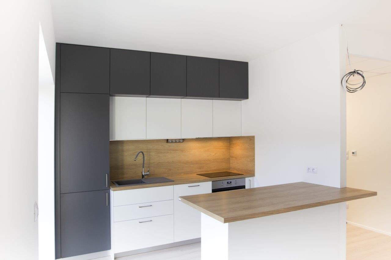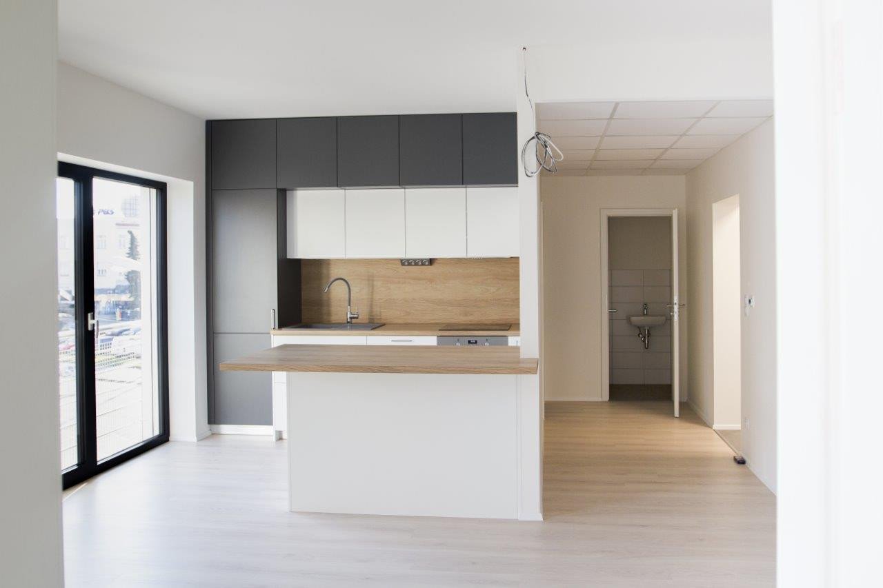 Byt ve vybaven moderní kuchyňskou linkou s efektivně řešeným úložným prostorem. Součástí je sporák s indukční deskou, osvětlená výkonná digestoř, myčka nádobí, prostorná vestavná lednice a mrazící box.