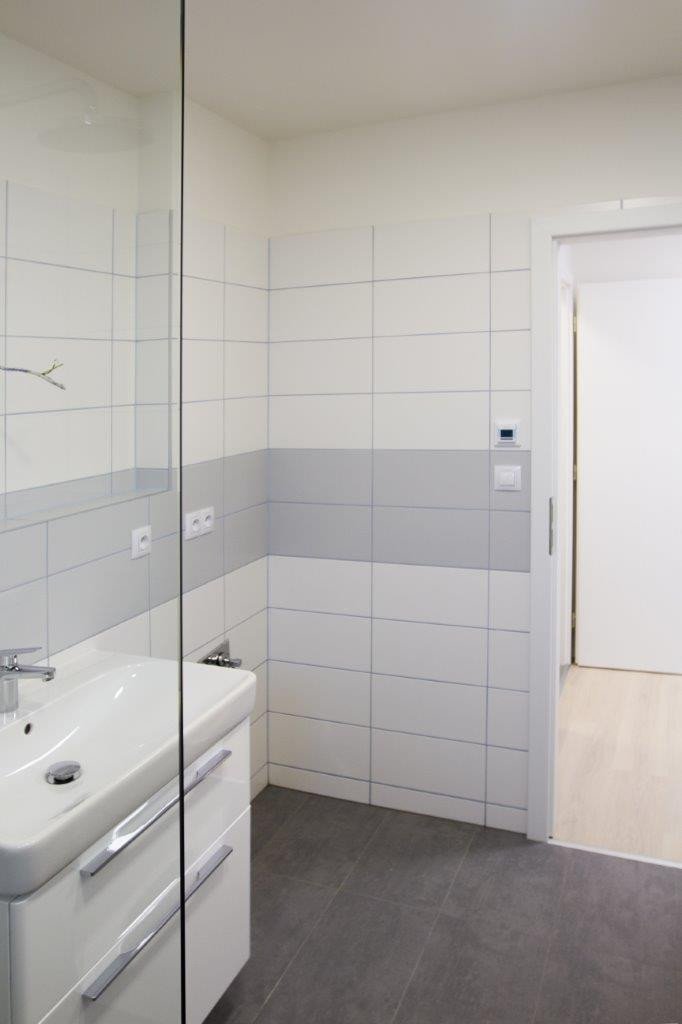 Koupelna se sprchovým koutem je vybavena masážní sprchovou hlavicí, osvětlenou zrcadlovou skříňkou; v případě zájmu bude v rámci uvedené ceny doplněna také pračka.