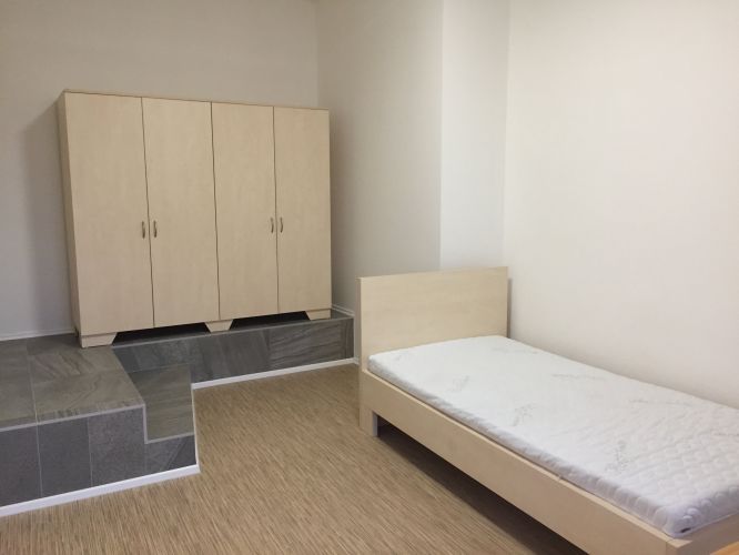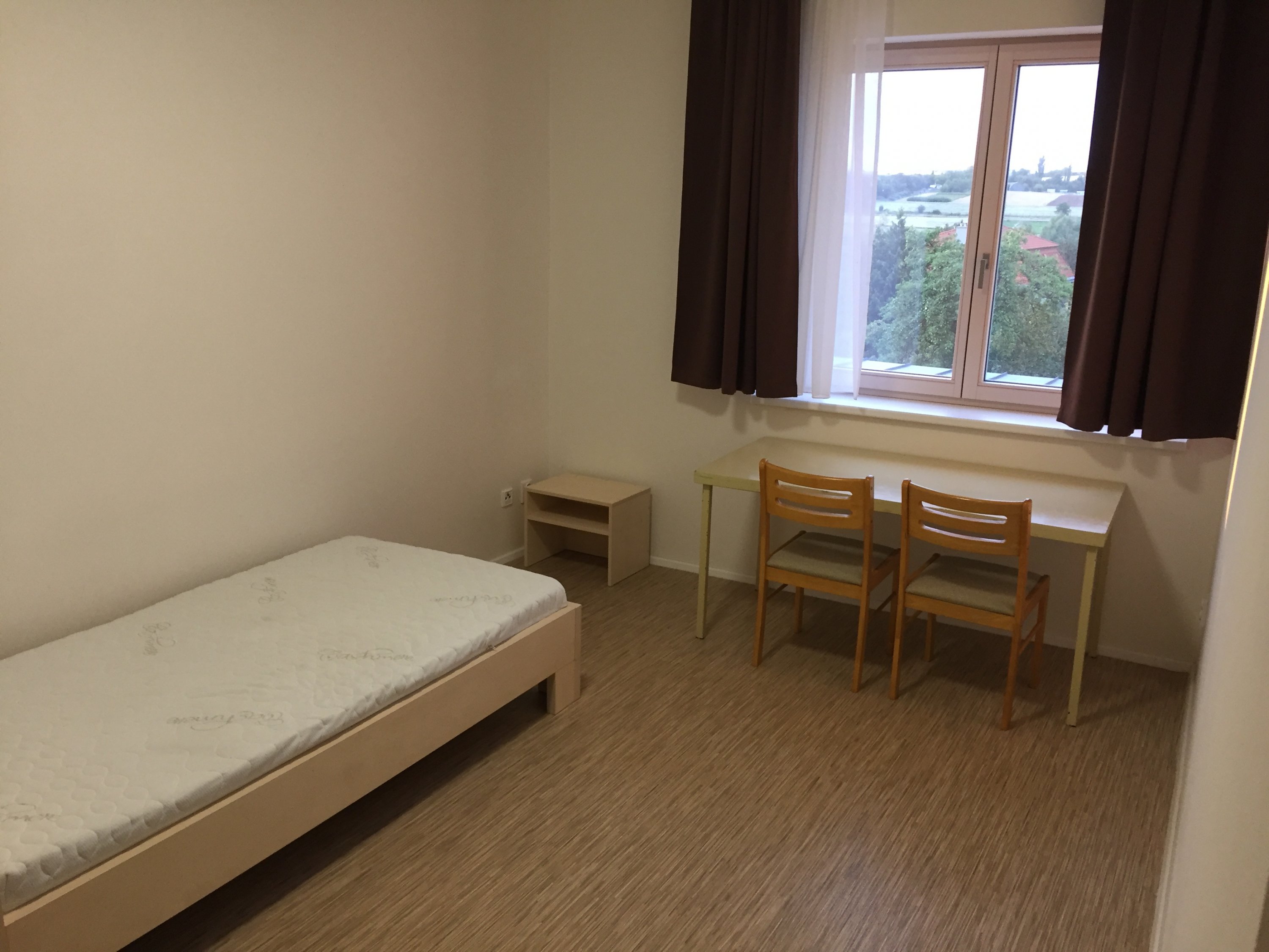 K pokoji náleží koupelna s toaletou zdílaná ještě jednou osobou. Vybavená kuchyňka vč. myčky nádobí.postelí, Pokoj je vybavn postelí, šatní skříní, jídelním/psacím stolem a židlemi.