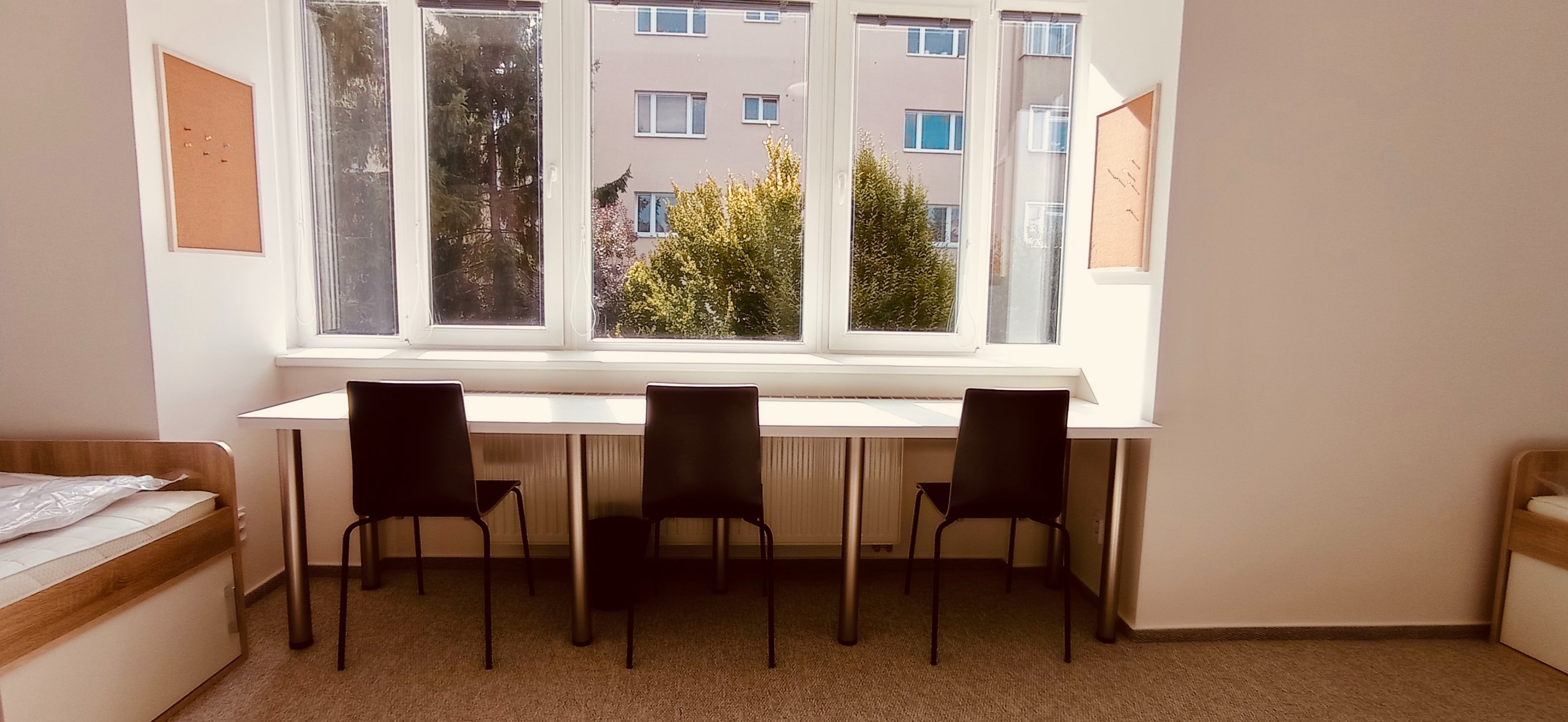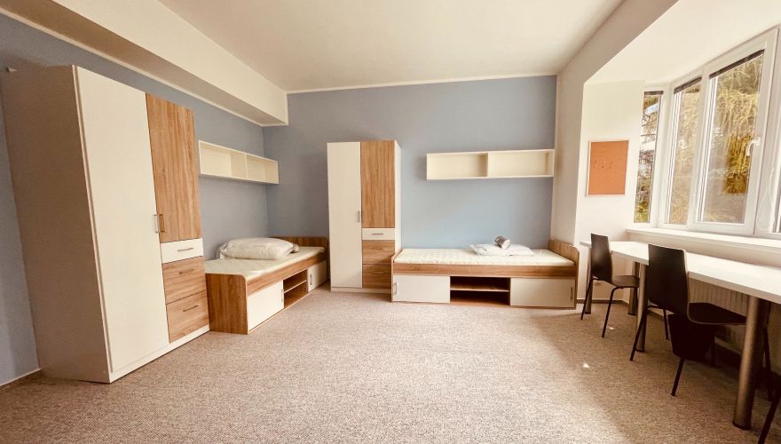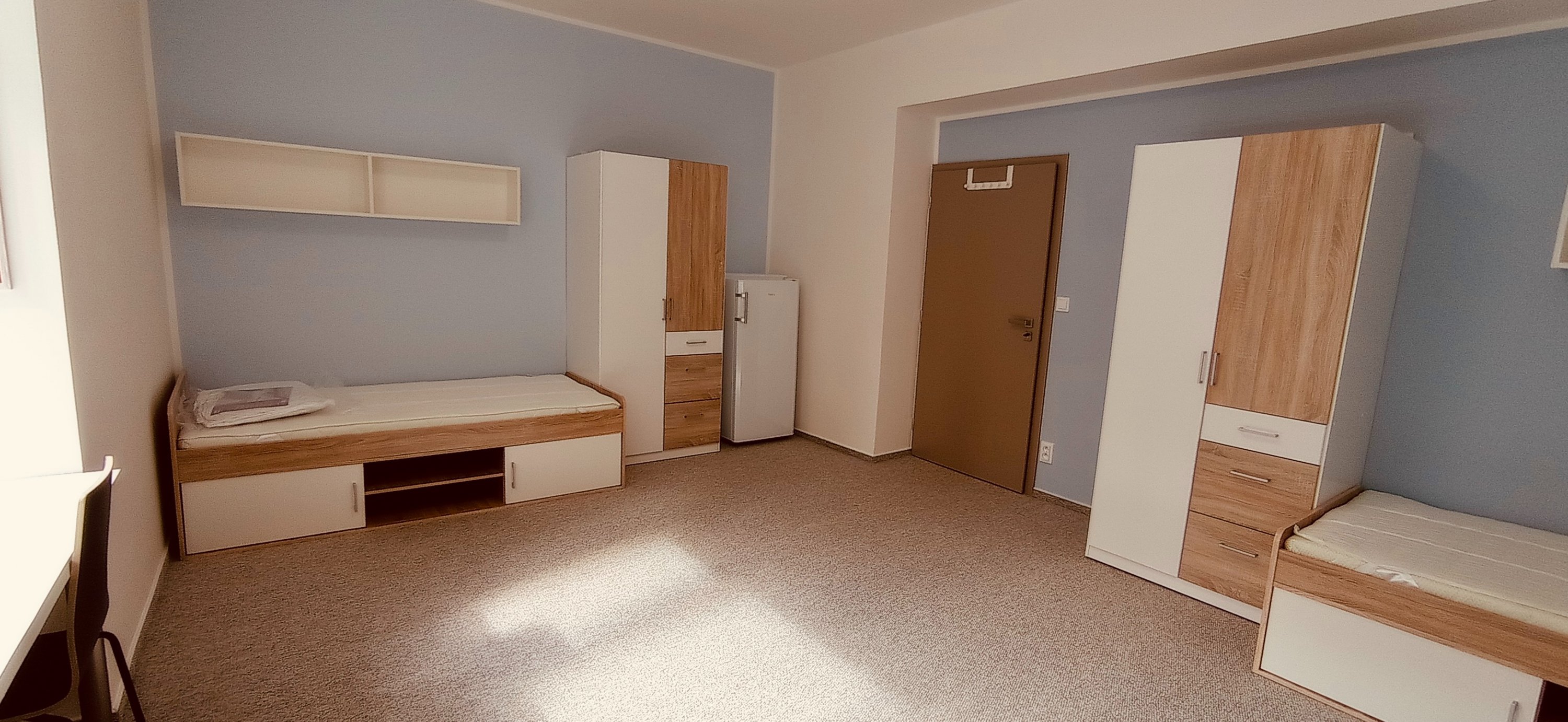 Pokoj se nachází ve druhém patře studentského domu, je vybavený 3x samostatnou postelí, skříní, psacím stolem, židlemi a ledničkou.