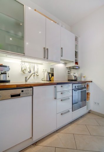 Vysoce kvalitní vybavení: parkety, přírodní břidlice v koupelně / kuchyni / zádveří, venkovní zástěny / žaluzie, podlahové topení, moderní kuchyně včetně všech spotřebičů (pračka, elektrický sporák se sklokeramickou deskou, digestoř, lednice s mrazákem a mikrovlnka). Prostorově úsporné posuvné dveře běžící ve stěně mezi obývacím pokojem a předsíní nebo ložnicí. Luxusně plně zařízený a moderně vybavený apartmán kazí náročný vkus vytříbeným designem v teplých zemitých tónech a funkčností.
