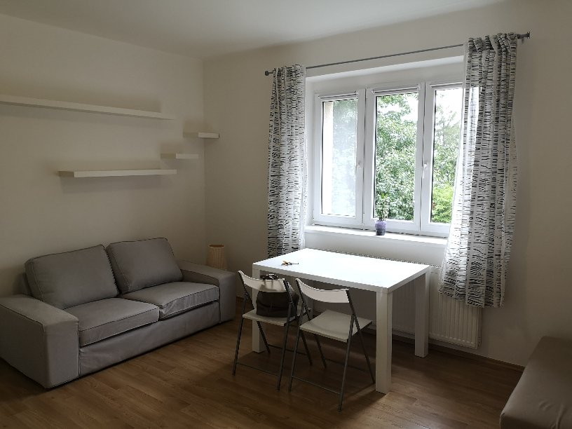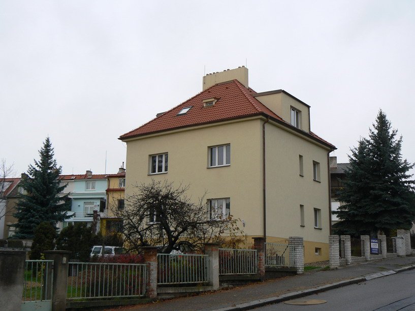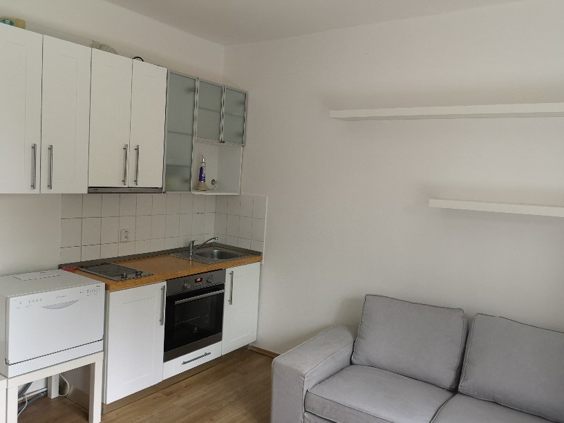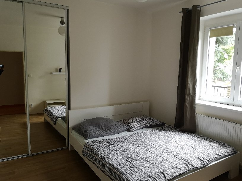 Byt 2+kk v činžovní vilce se zahradou. 1. nadzemním podlaží o velikosti 35m2 se sestává se z obývacího pokoje, ložnice, kuchyňského koutu s plně vybavenou kuchyňskou linkou, koupelny s pračkou a toaletou.