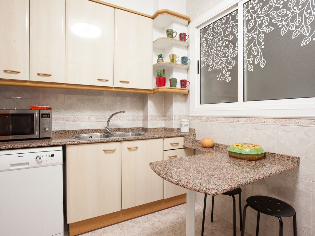 Velká koupelna, plně vybavená kuchyň, obývací pokoj a jídelna.