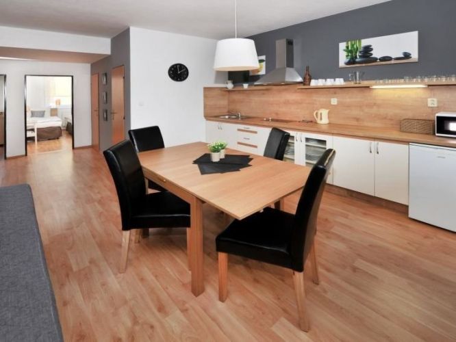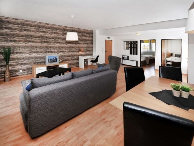 Moderní zařízení: obývací pokoj, ložnice s 1x pohovka pro 2 osoby, jídelní stůl a TV-satelit.
