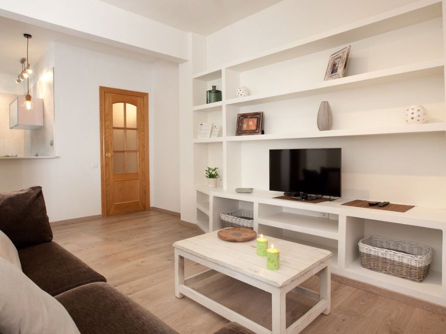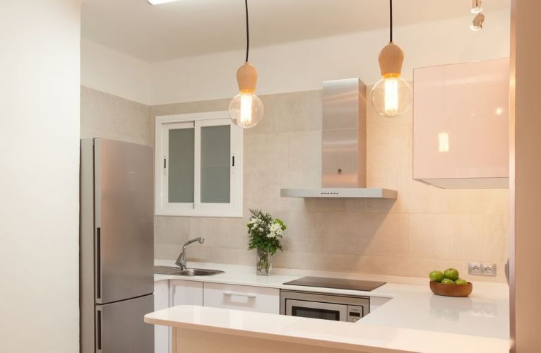Má obývací pokoj a kuchyň, světlý a vzdušný prostor.