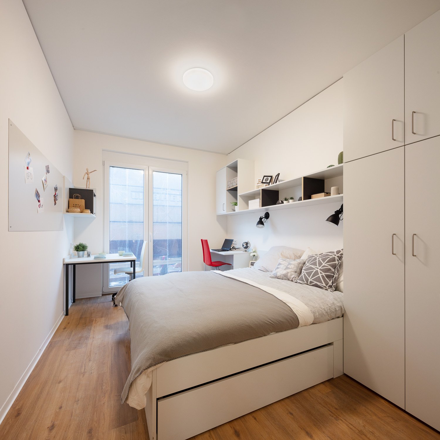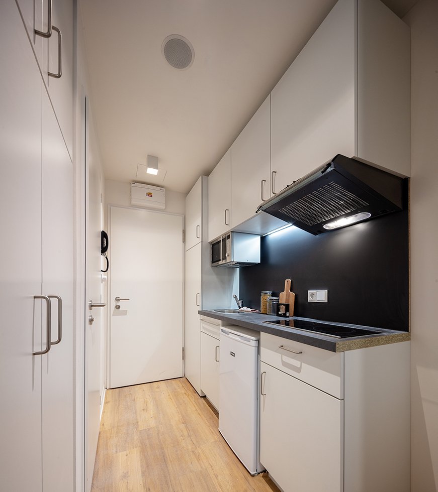 Inside the room there is a double bed, 2 desks, 2 wardrobes, a bathroom, a microwave, an induction hob, sink and fridge. The laundry room and community kitchen with ovens/dishwashers is located on floor 1. There is a lot of storage in the room. The room also comes with private wifi as well as community wifi in all areas of the building.