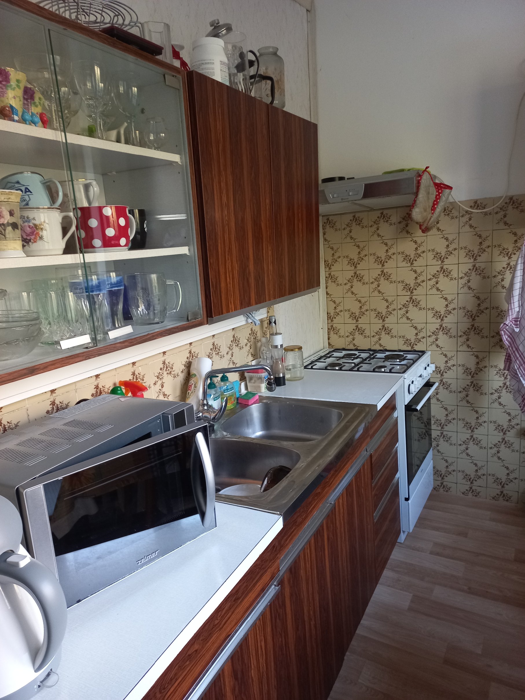 V bytě se nachází koupelna s vanou a pračkou. Záchod je samostatný. Kuchyně je vybavená jak troubou, plynovým sporákem, lednicí, rychlovarnou konvicí, tak i mikrovlnou troubou. Lze využít i sklep, ale je částečně zaplněný.