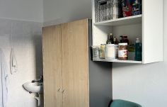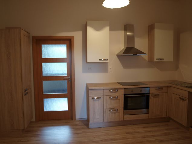 Kuchyň je vybavena kuchyňskou linkou, varnou deskou, troubou, digestoří a lednicí. V bytě je ústřední topení, teplá voda je řešena centrálním rozvodem. K bytu náleží větší sklep (5,5m2