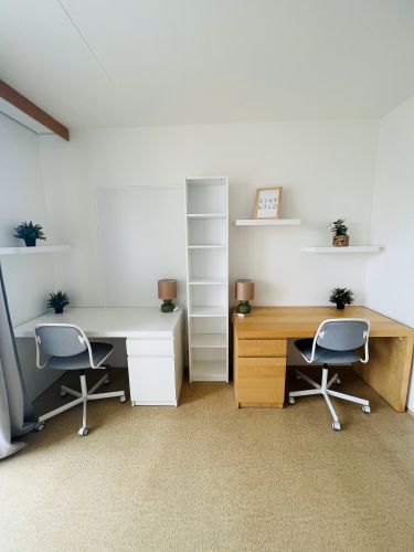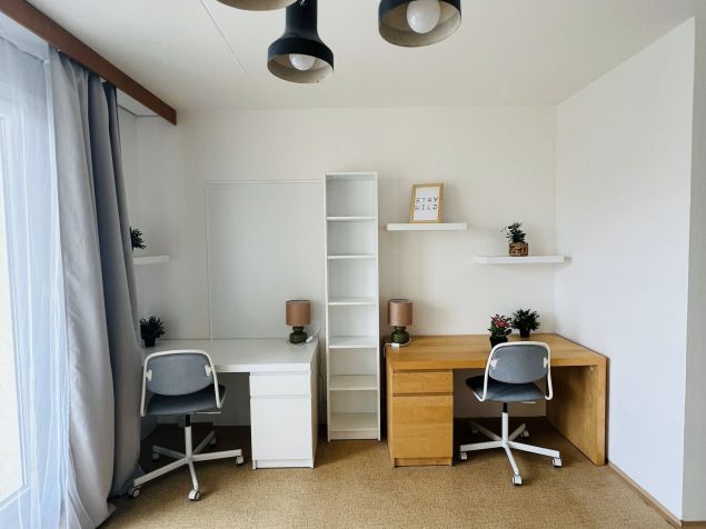 Vo voľnom pokoji sa nachádzajú 2 postele, 2 stoly, 2 židle a skríň + balkón. Lužko je dostupné od 1.7.2023.