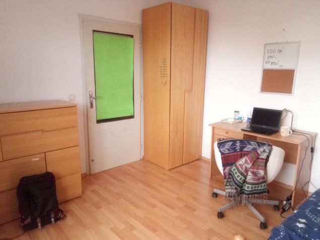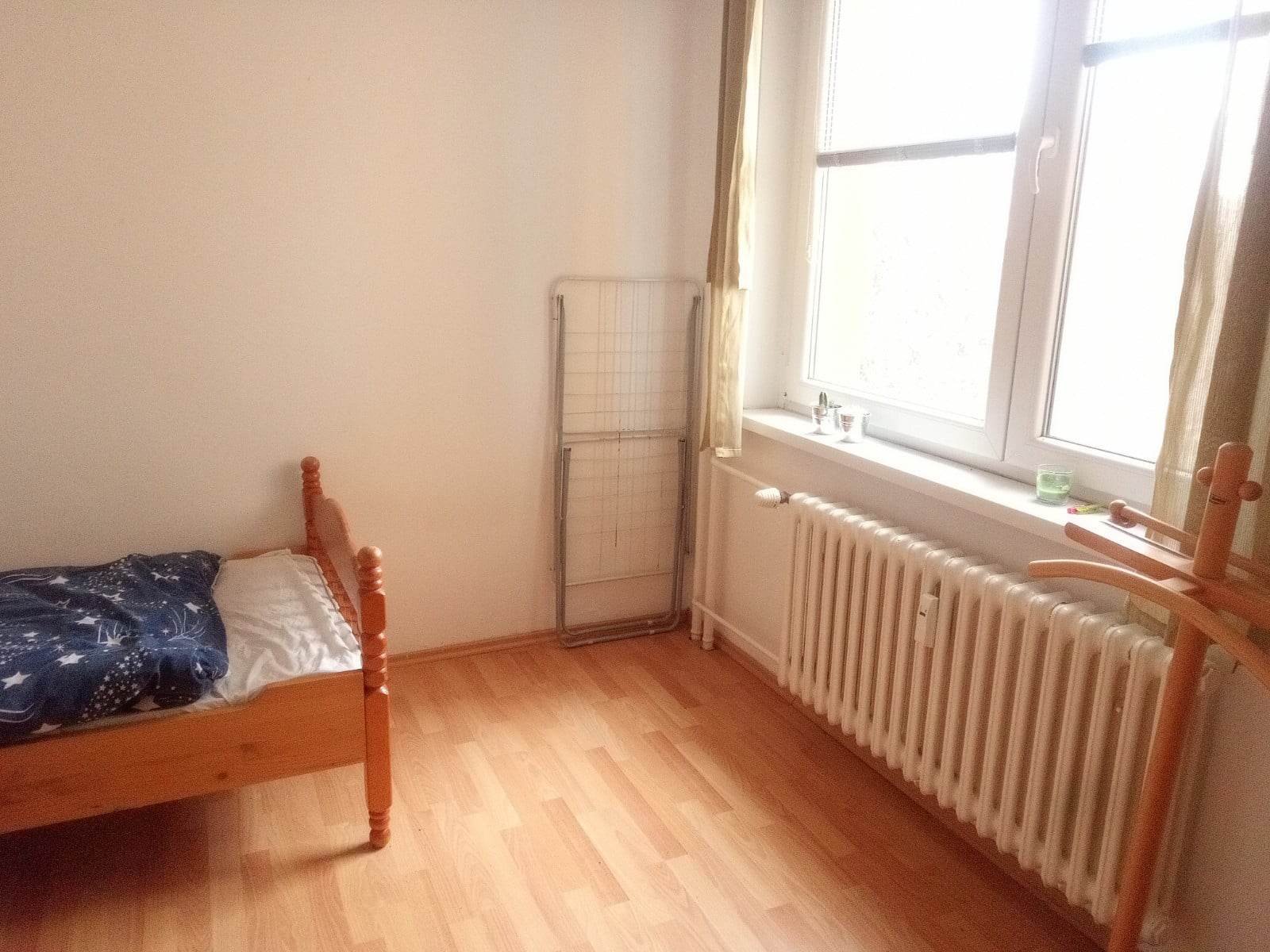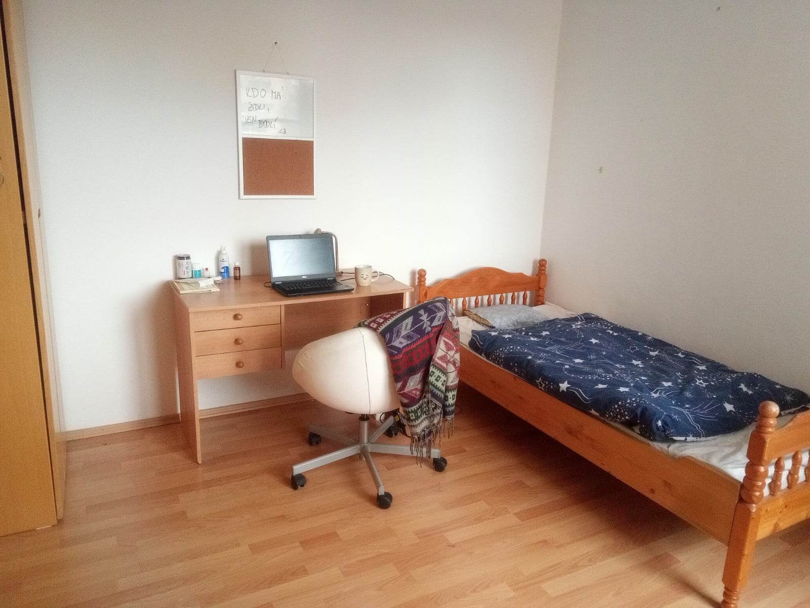 Uvolnilo se nám místo na bytě v jednolůžkovém vybaveném pokoji. Na bytě dále bydlí dva kluci (22 a 25 let) a jedna holka (28 let). Nachází se na ulici Běloruská, kde je plná občanská vybavenost (Albert, pošta, vinárna, lékárna, zdravotní středisko, městský úřad, kadeřník…). Byt se nachází ve 4. patře s výtahem a je prostorný.