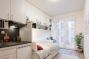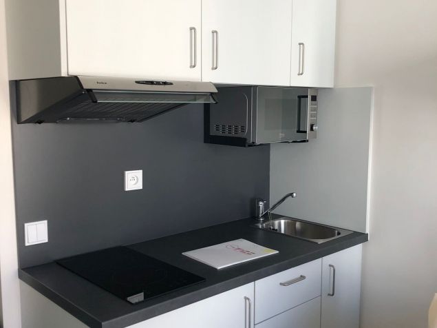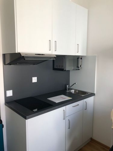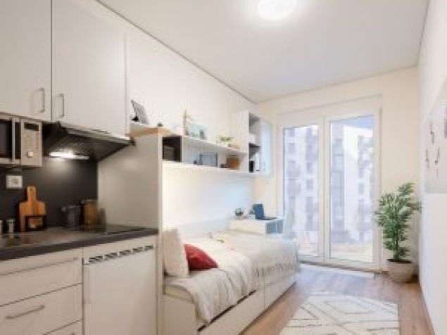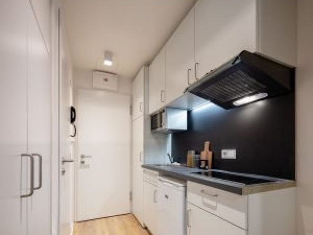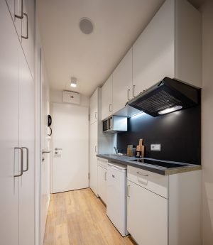 Individual room in a student residence including individual bathroom and kitchen in the room. Equipated with microwave, fridge and toaster in the room and oven, dryers and washing machines in the commun areas of the residence.