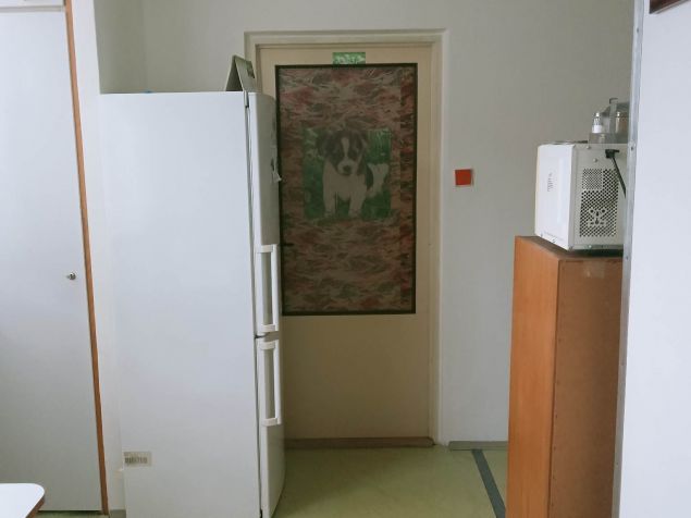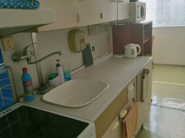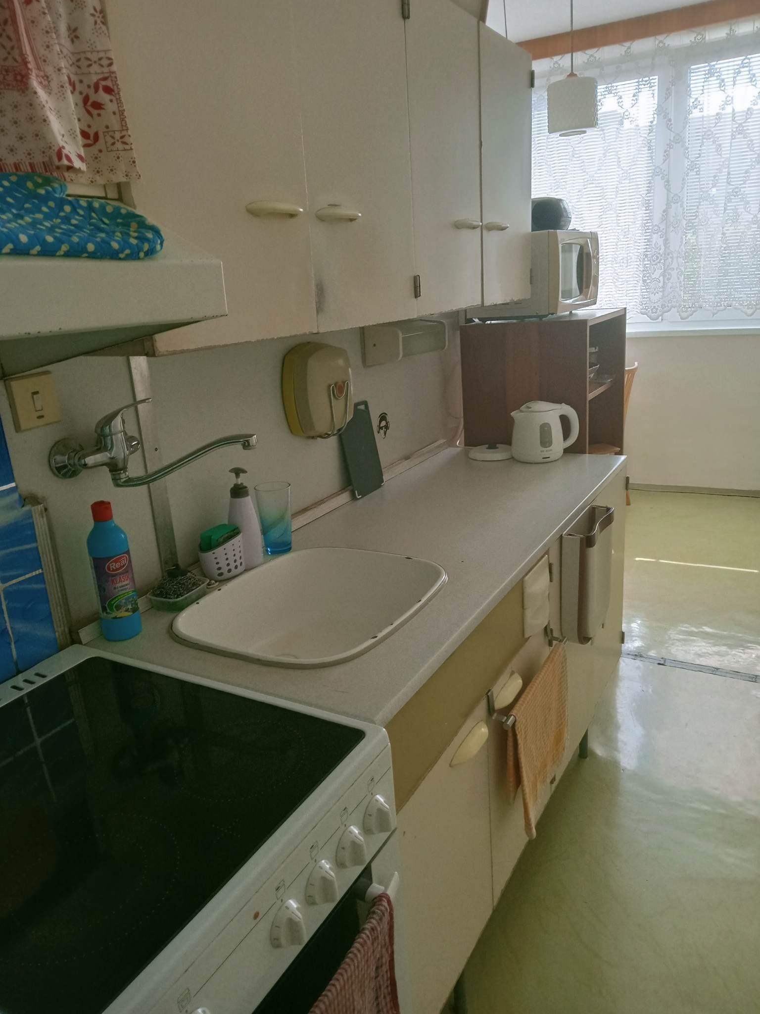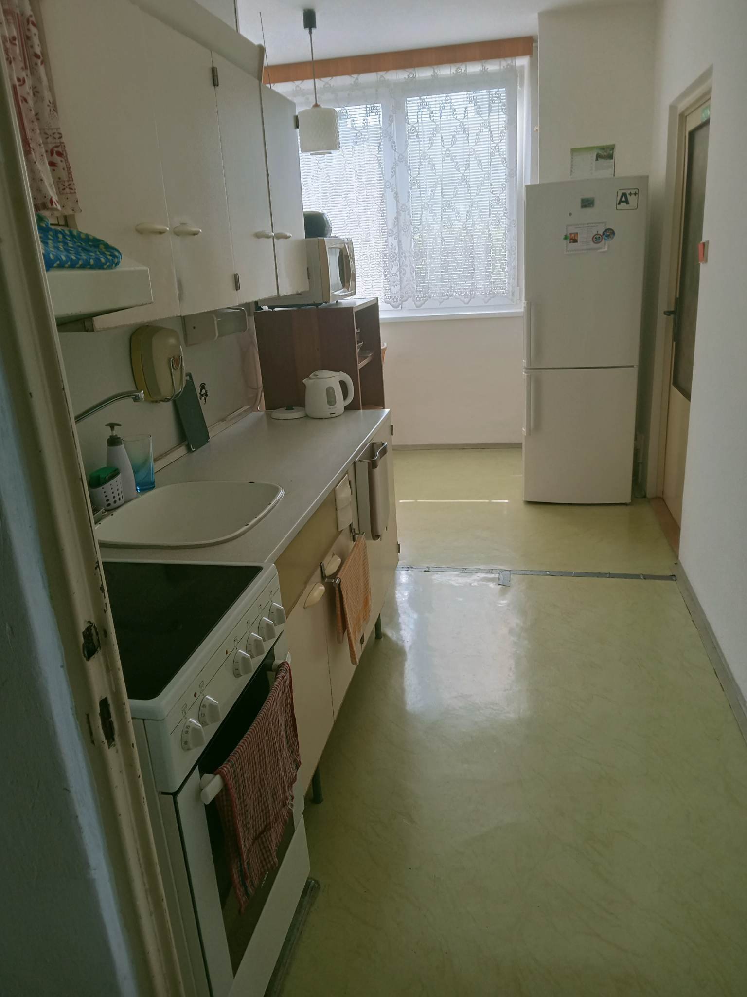 Kuchyň-stůl-židle-lednice-mikrovlnka-sporák a nějaké vybavení kuchyně ( příbory, talíře, sklenice, hrnce vše co tu zůstalo po původních najemnicich).